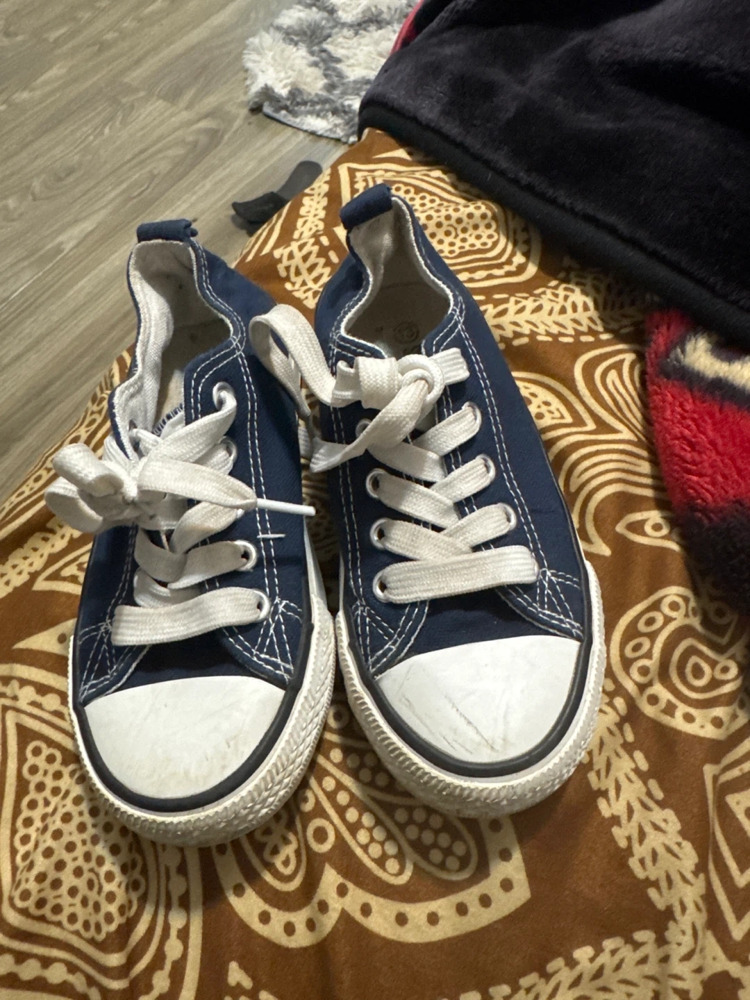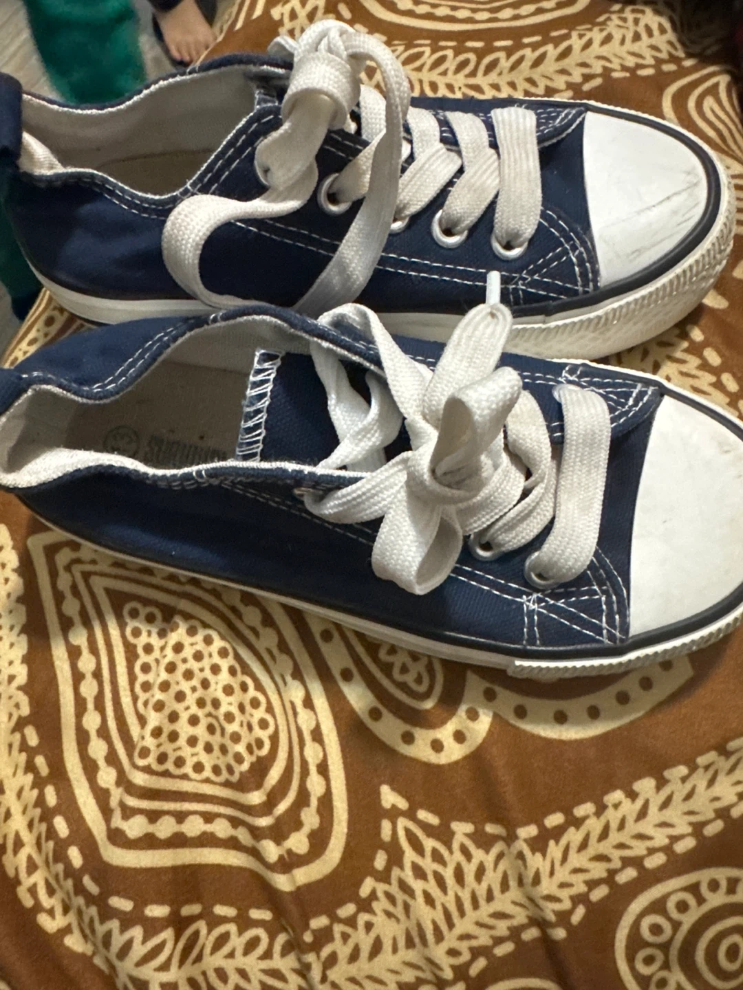 Blue canvas sneakers with white laces. Features white rubber toe caps and soles with "Sport" branding. The interior shows "Survival Gear" and size 13