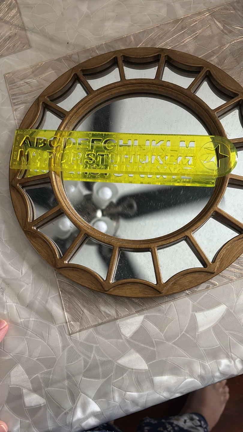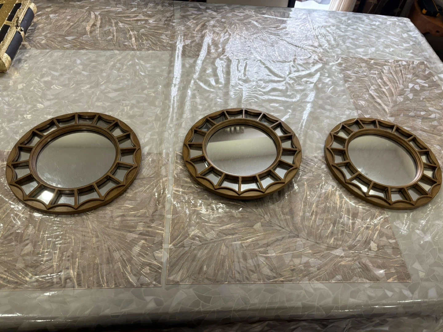 These decorative mirrors have a wooden frame with a sunburst design. They're great for adding a touch of style to any room. Each mirror measures approximately 12 inches in diameter.