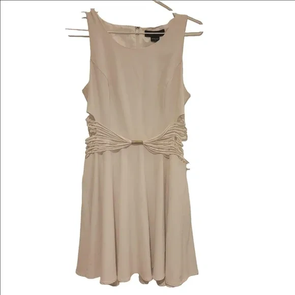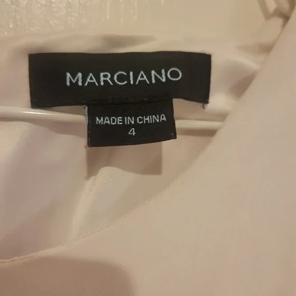 Selling a Marciano dress in size 4. It's White and made of 70% acetate and 30% polyester. The dress has a unique design with cutouts and a decorative knot at the waist. Perfect for a special occasion!