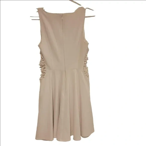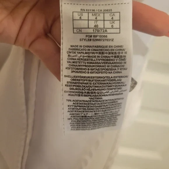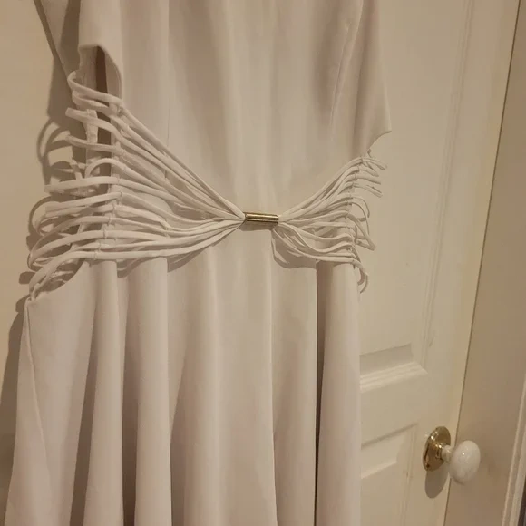 Selling a Marciano dress in size 4. It's White and made of 70% acetate and 30% polyester. The dress has a unique design with cutouts and a decorative knot at the waist. Perfect for a special occasion!