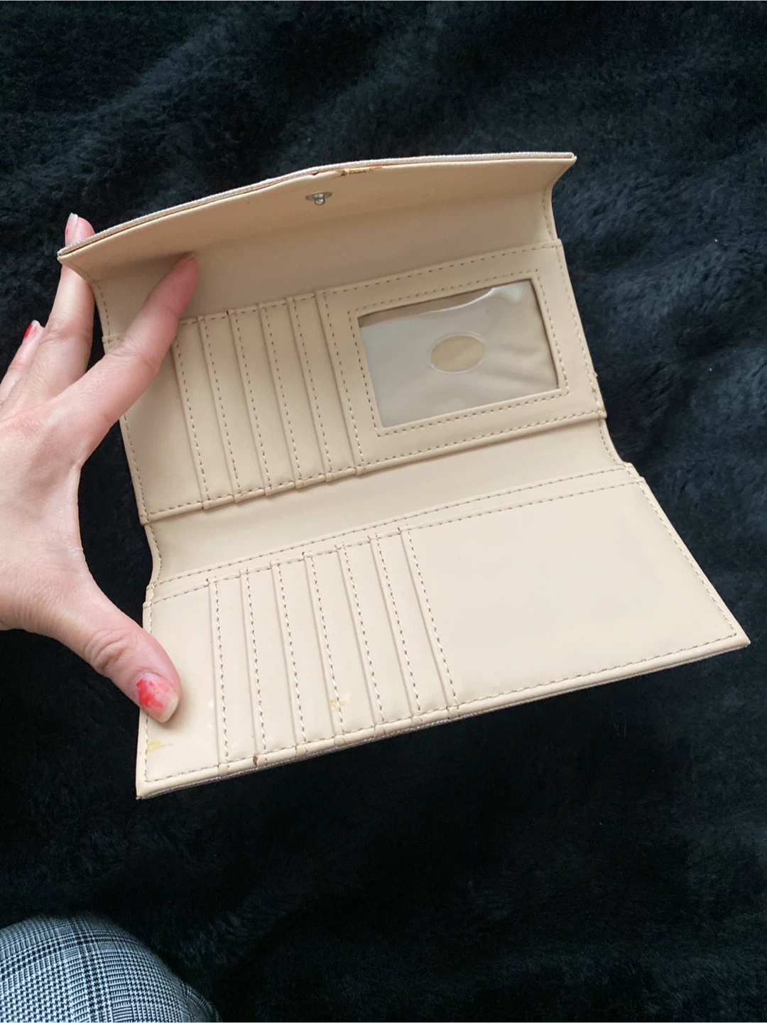 A silver Guess wallet with multiple card slots and an ID window. It's made of faux leather and has a snap closure. This wallet is perfect for keeping your essentials organized. Pick up cash only