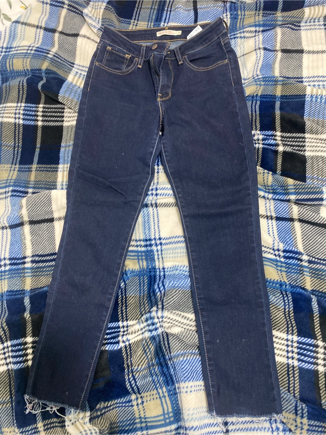 Levi's dark wash denim jeans. These women's jeans have a cropped, raw hem. They're made from a comfortable cotton blend. Size 26 pick up cash only