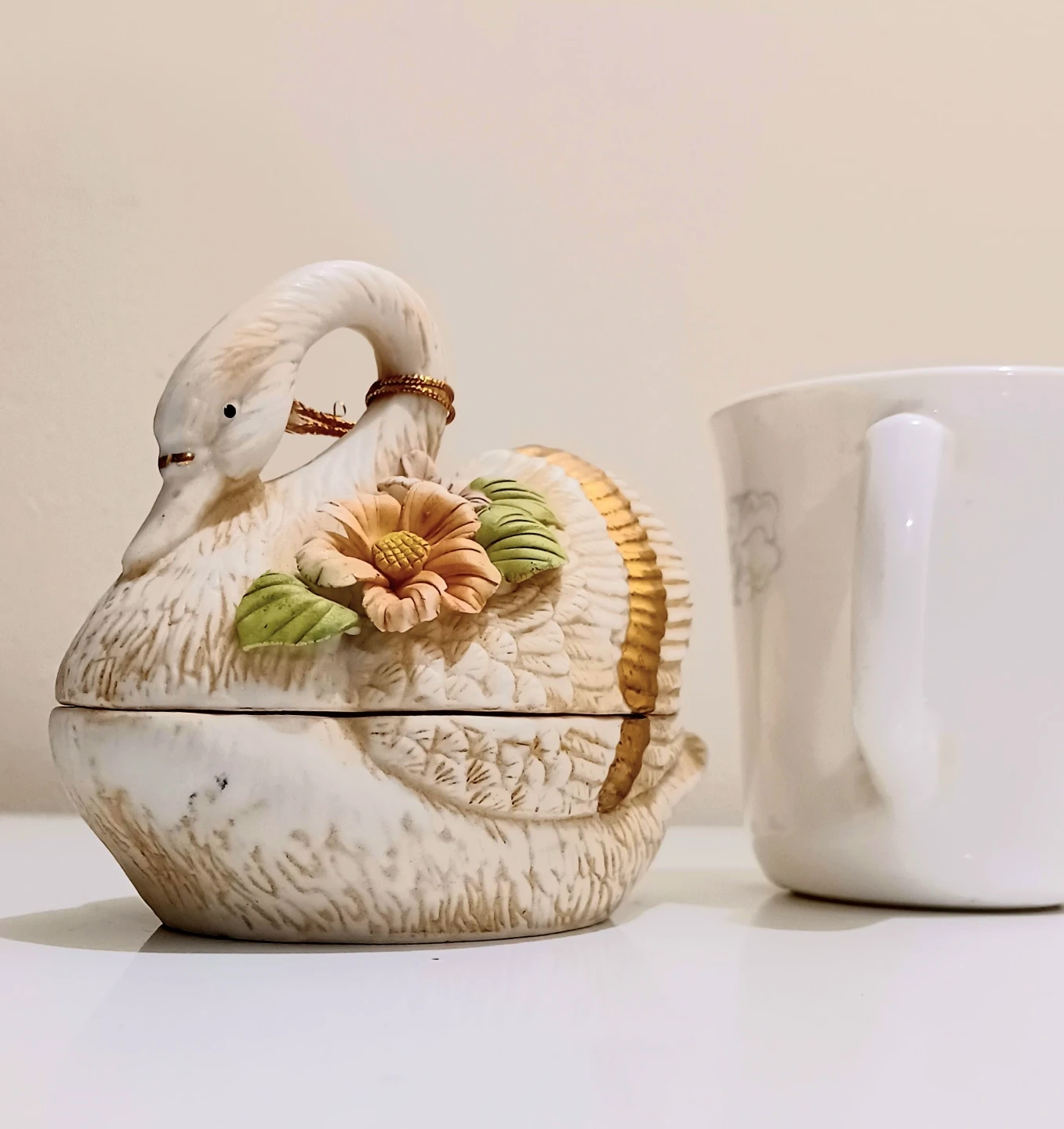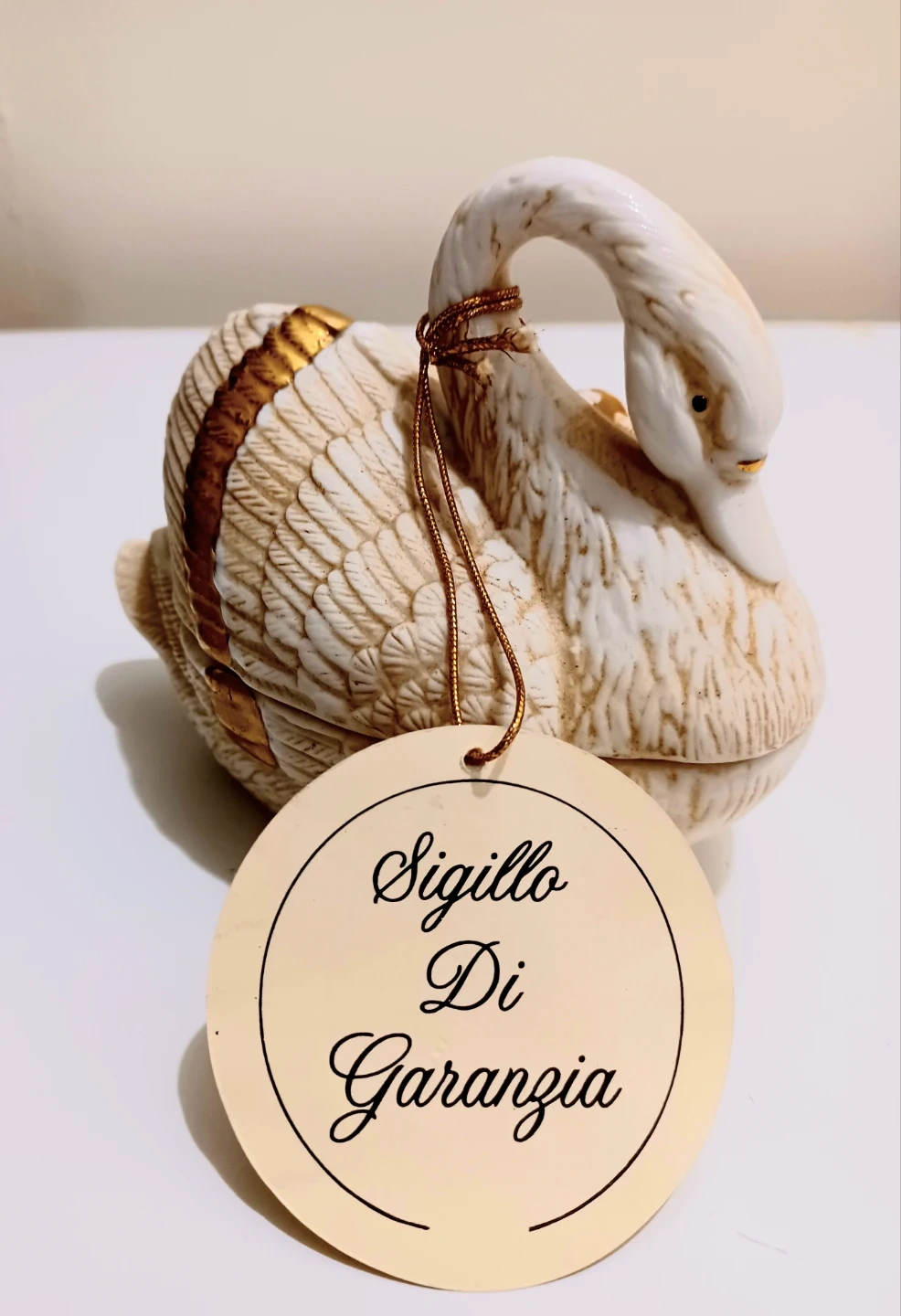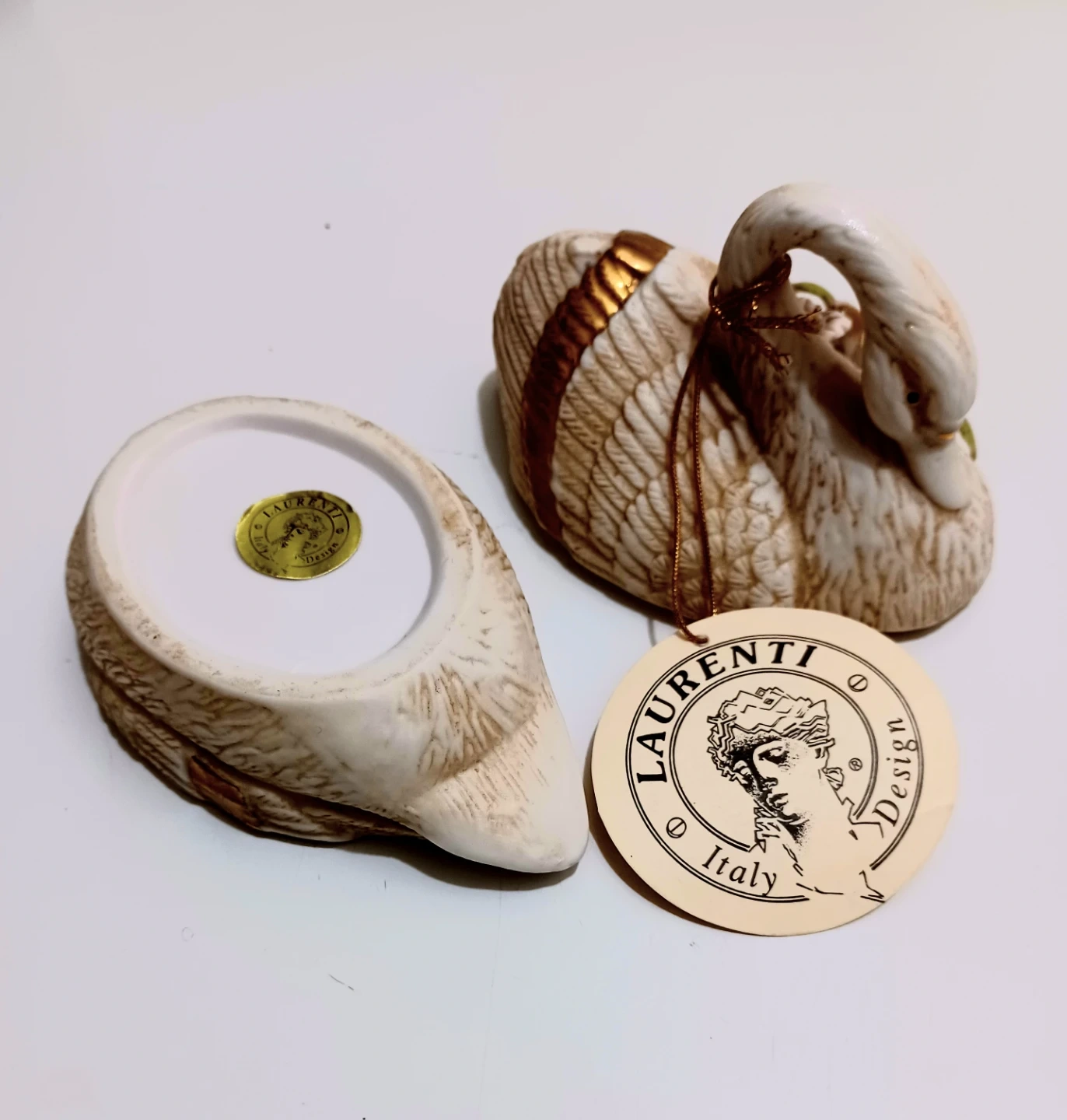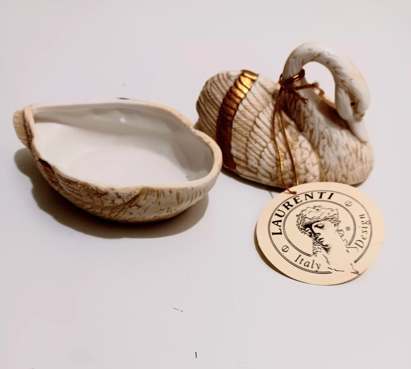 This is a lovely Laurenti Swan Trinket Box. It's a decorative piece that can also store small items. As seen in the photos, it is in Excellent condition, with original tags & Stickers