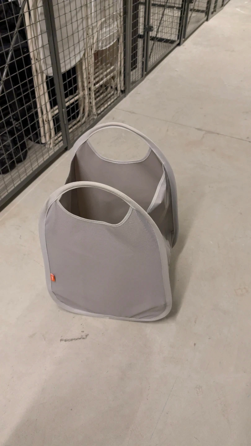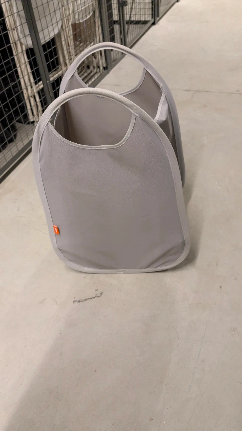 This collapsible laundry basket is a handy storage solution. It's made from a durable fabric material. The basket folds flat for easy storage when not in use.