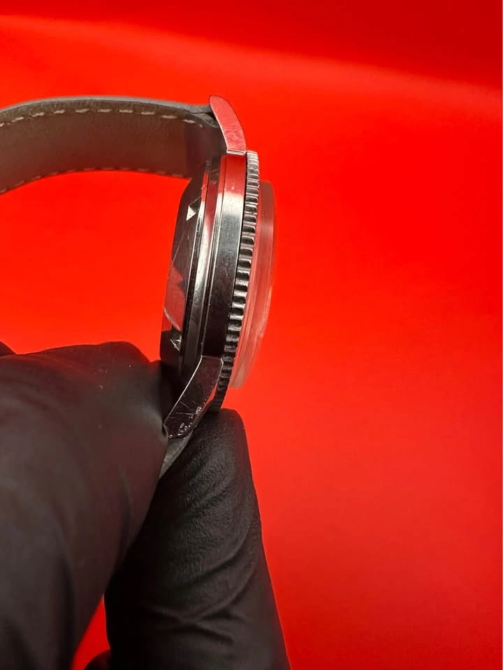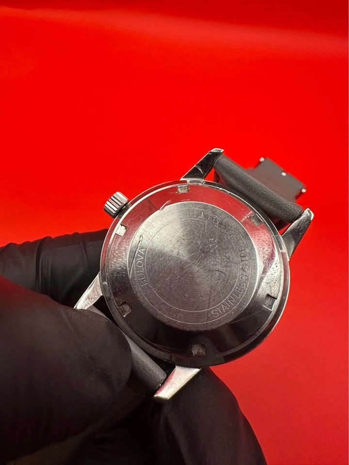 Vintage Bulova Self-Winding Diver, commonly known as the Bulova Snorkel, from the late 1960s. Classic skin-diver case with rotating bezel and high-contrast dial. Details: Brand: Bulova Watch Co. Era: c. 1967–1969 Movement: Automatic (self-winding), Swiss, 23 jewels, unadjusted Case: Stainless steel Bezel: Rotating diver bezel Dial: Original, aged patina Crystal: Acrylic Case back: Marked MLB Swiss Size: ~35 mm case (excluding crown) Strap: Modern leather strap (not original). Condition: The watch winds and runs, but runs fast and will need regulation/service for accurate daily wear. Case and bezel show wear consistent with age. Dial has honest vintage patina. This is a great candidate for a collector project or someone who wants a true vintage diver.