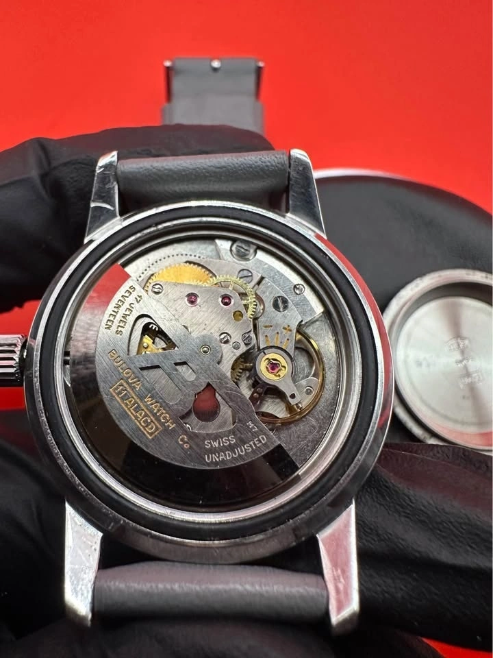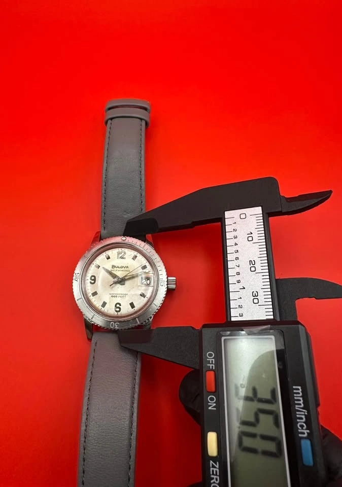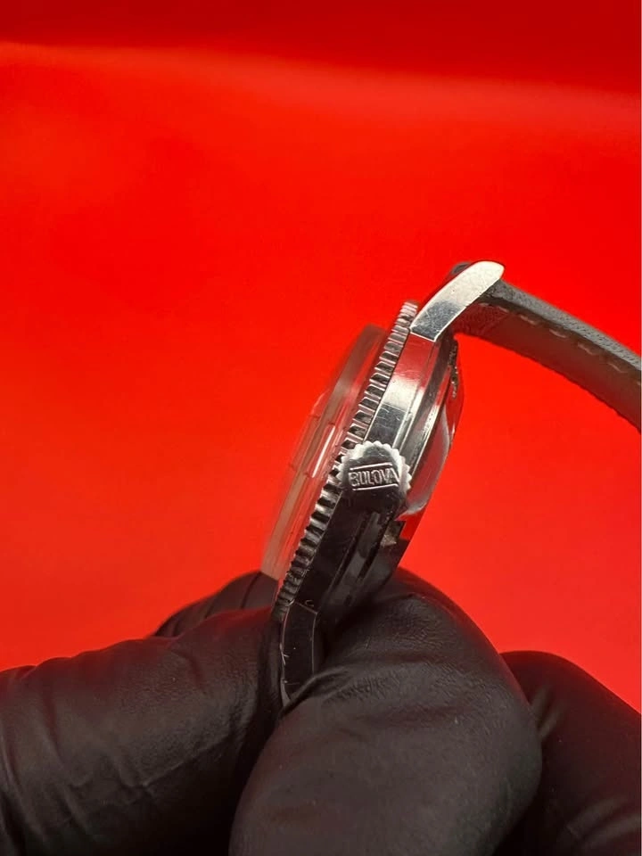 Vintage Bulova Self-Winding Diver, commonly known as the Bulova Snorkel, from the late 1960s. Classic skin-diver case with rotating bezel and high-contrast dial. Details: Brand: Bulova Watch Co. Era: c. 1967–1969 Movement: Automatic (self-winding), Swiss, 23 jewels, unadjusted Case: Stainless steel Bezel: Rotating diver bezel Dial: Original, aged patina Crystal: Acrylic Case back: Marked MLB Swiss Size: ~35 mm case (excluding crown) Strap: Modern leather strap (not original). Condition: The watch winds and runs, but runs fast and will need regulation/service for accurate daily wear. Case and bezel show wear consistent with age. Dial has honest vintage patina. This is a great candidate for a collector project or someone who wants a true vintage diver.