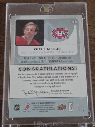 Authentic Guy Lafleur signed trading card from 2012–13 Upper Deck SP Game Used Hockey (#46). Features a certified on-card autograph, guaranteed authentic by Upper Deck. Includes the official certification statement on the reverse. Player: Guy Lafleur (Hockey Hall of Fame), Team: Montreal Canadiens, Set: 2012–13 SP Game Used Hockey, Card Number: #46, Autograph: On-card, Upper Deck certified, Condition: Excellent (stored in One-Touch magnetic holder). A fantastic piece for Canadiens collectors, Hall of Fame collectors, or autograph investors. Guy Lafleur is one of the most iconic players in NHL history. Feel free to message with any questions.