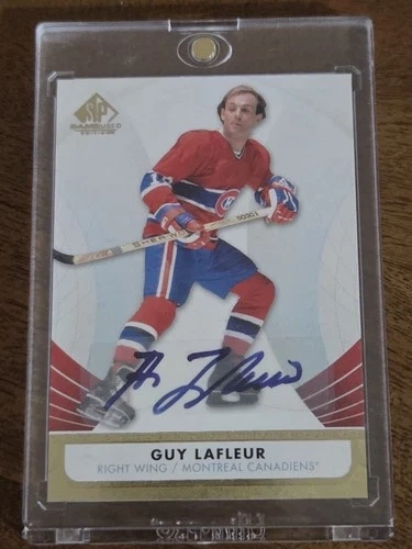Authentic Guy Lafleur signed trading card from 2012–13 Upper Deck SP Game Used Hockey (#46). Features a certified on-card autograph, guaranteed authentic by Upper Deck. Includes the official certification statement on the reverse. Player: Guy Lafleur (Hockey Hall of Fame), Team: Montreal Canadiens, Set: 2012–13 SP Game Used Hockey, Card Number: #46, Autograph: On-card, Upper Deck certified, Condition: Excellent (stored in One-Touch magnetic holder). A fantastic piece for Canadiens collectors, Hall of Fame collectors, or autograph investors. Guy Lafleur is one of the most iconic players in NHL history. Feel free to message with any questions.