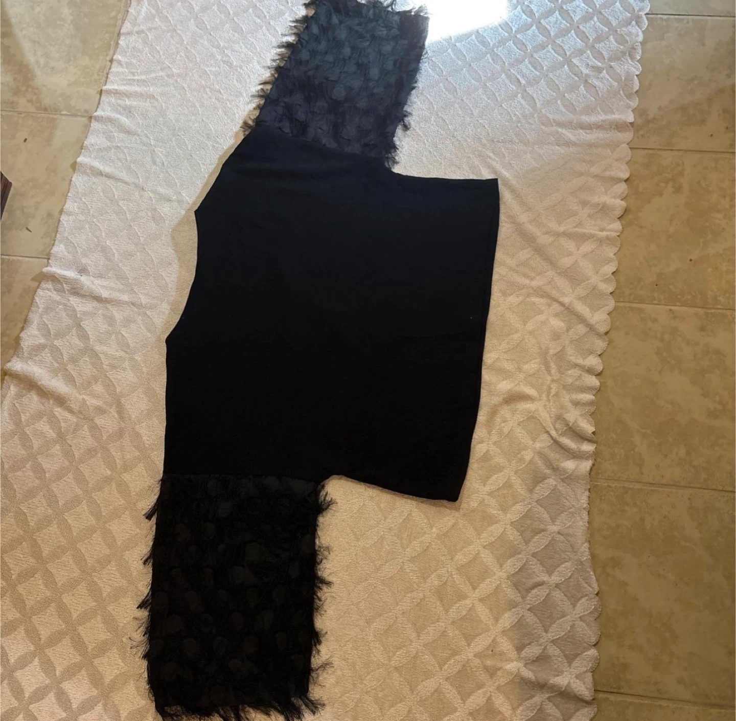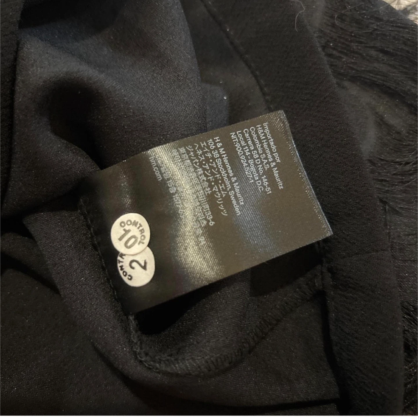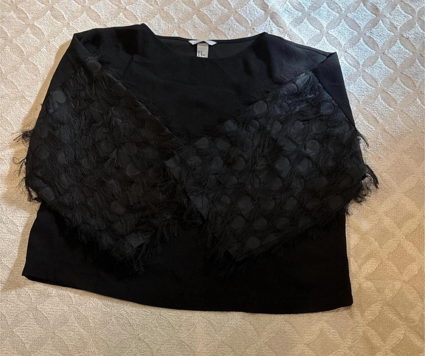This black H&M blouse is made of 100% polyester. It's a size US 10 (EUR 40). Features textured fringe detailing on the sleeves.