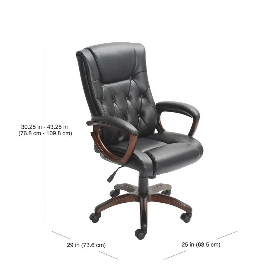 This chair features leather on all seating surfaces with matching vinyl on the back and sides for a rich look. It includes lumbar support, a headrest, and soft, upholstered arm pads for comfort. The pneumatic gas lift, tilt tension adjustment, and lockout lever allow for optimal positioning. It has a heavy-duty base with scuff-resistant footers and dual-wheel casters for sturdiness. Traditional styling with elegant, hand-sculpted arms. Simple to assemble, dimensions are 25" W x 29" D x 30.25" to 43.25" H. Supports up to 250 lb.
