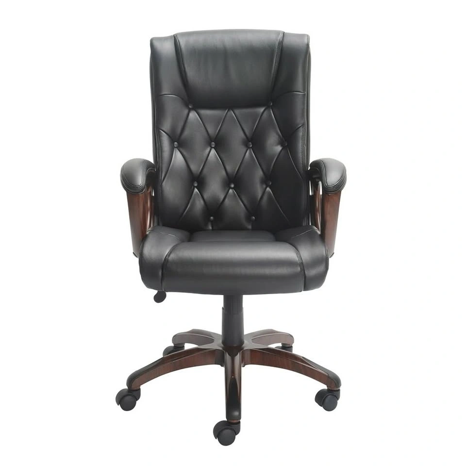 This chair features leather on all seating surfaces with matching vinyl on the back and sides for a rich look. It includes lumbar support, a headrest, and soft, upholstered arm pads for comfort. The pneumatic gas lift, tilt tension adjustment, and lockout lever allow for optimal positioning. It has a heavy-duty base with scuff-resistant footers and dual-wheel casters for sturdiness. Traditional styling with elegant, hand-sculpted arms. Simple to assemble, dimensions are 25" W x 29" D x 30.25" to 43.25" H. Supports up to 250 lb.