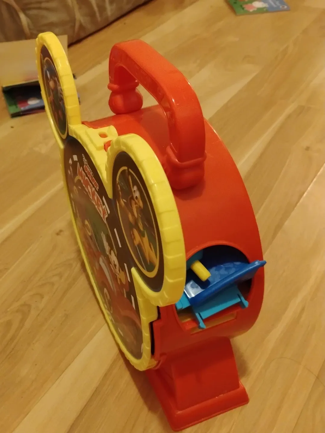 This is a Disney Mickey Mouse Clubhouse toy. It's red and yellow with Mickey Mouse graphics. It has a carrying handle and an opening for small parts.