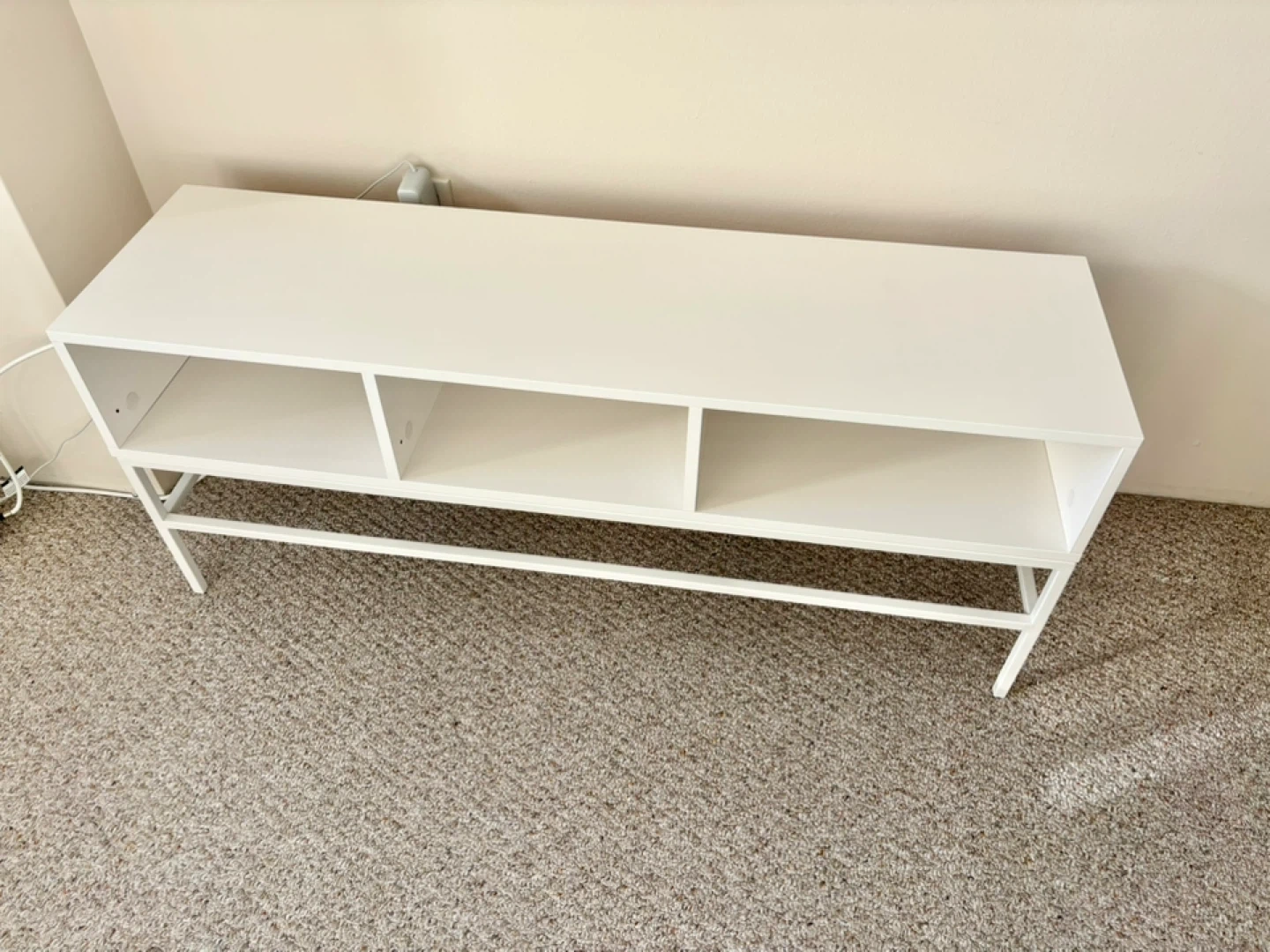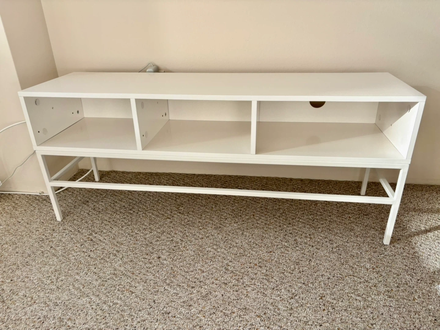 White media console with three open shelves. It's a simple and clean design. Great for a TV stand or storage unit. Pick up only. Moving must go by Feb 15th.