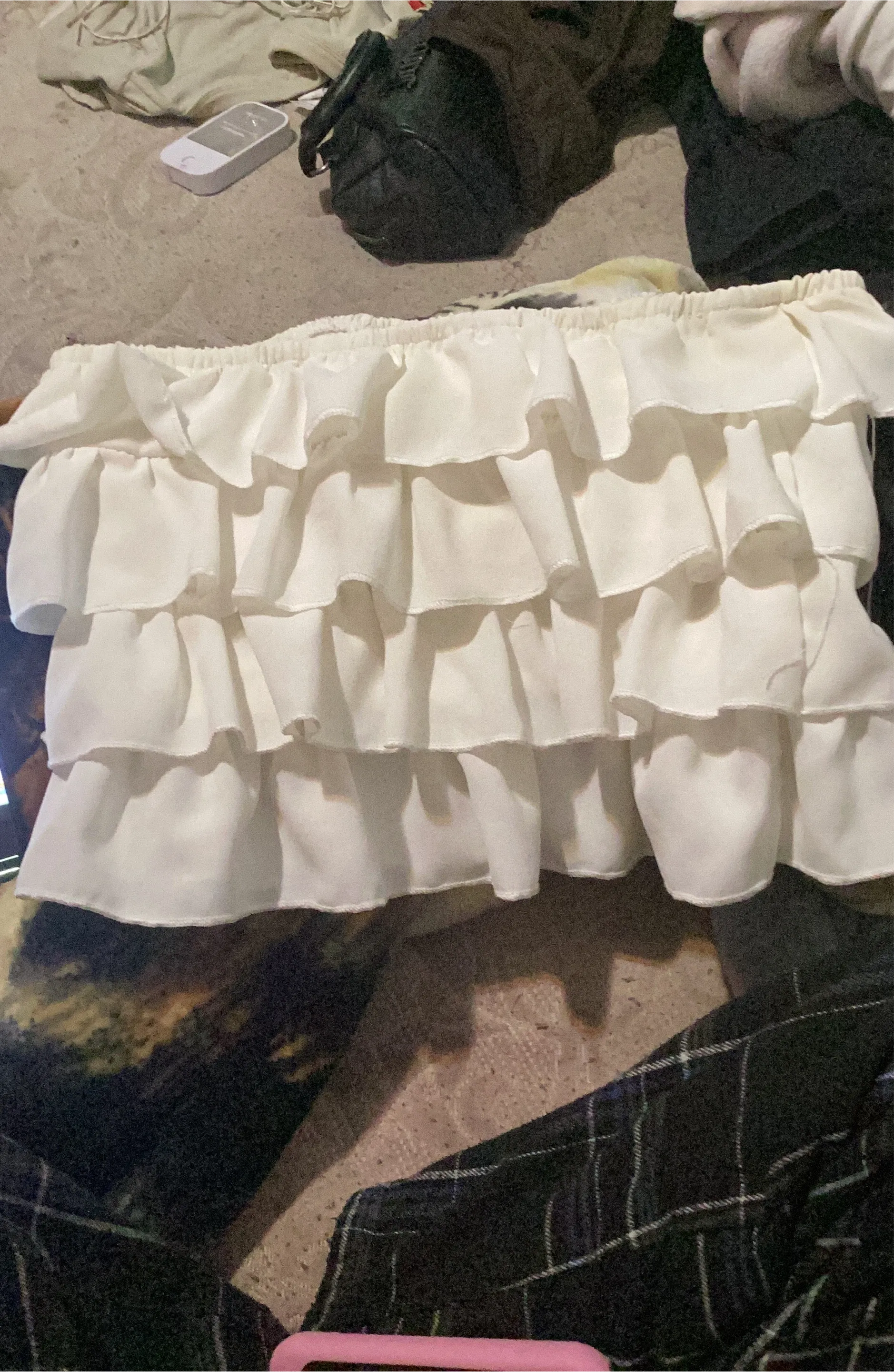 This is a white mini skirt It features multiple tiers of ruffles for a playful look. It's made of a lightweight fabric.