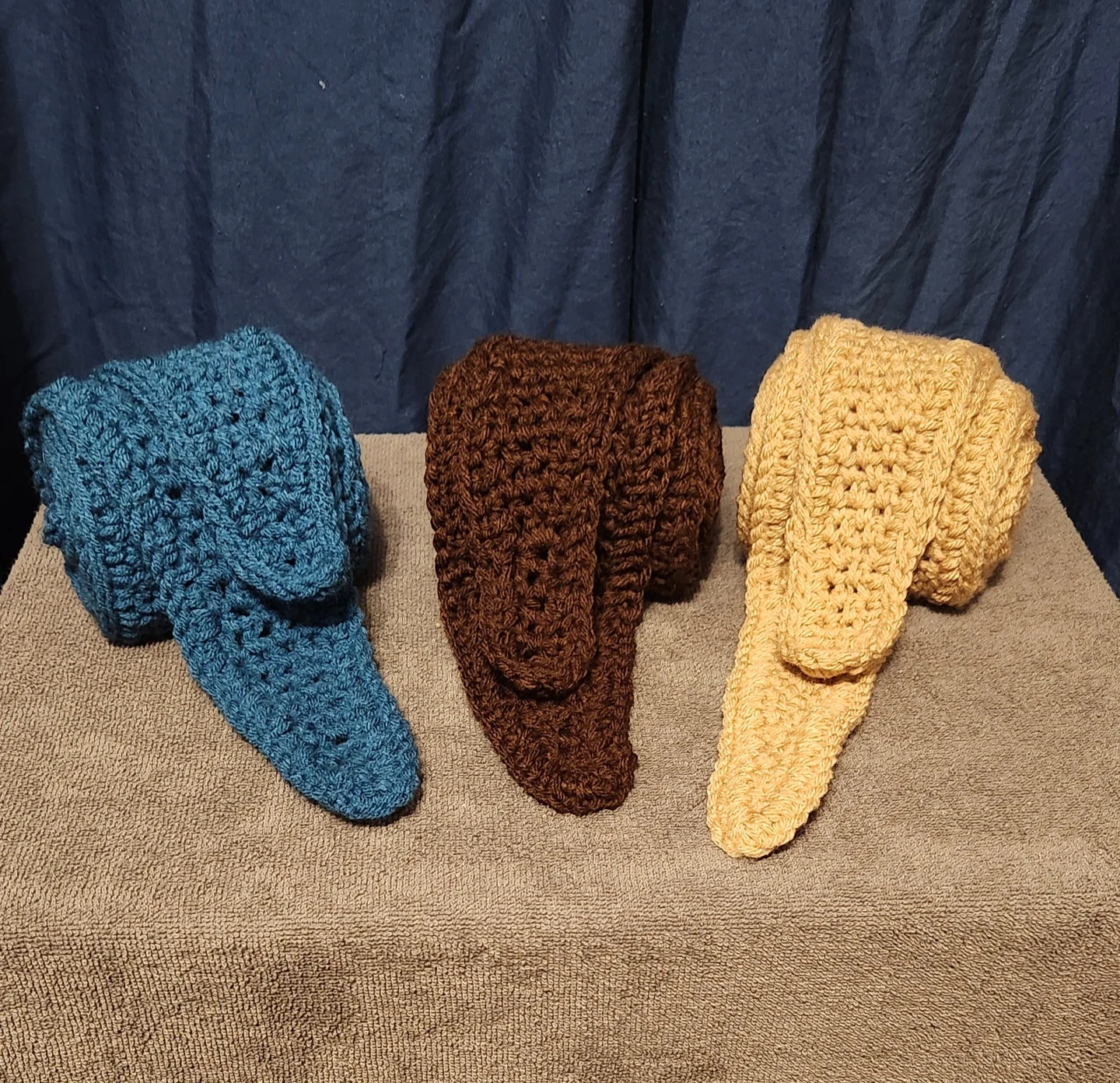 These are handmade crochet skinny scarves in three colours. They are to be made of acrylic yarn. They're cozy and warm for the cold winter days.. These would be great for keeping you warm and looking great during the cold winter weather!