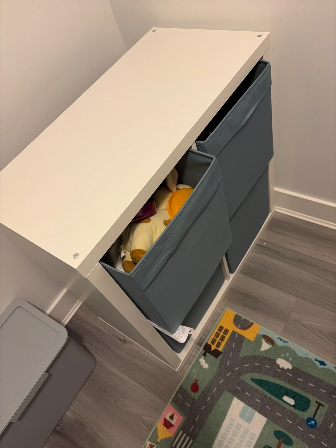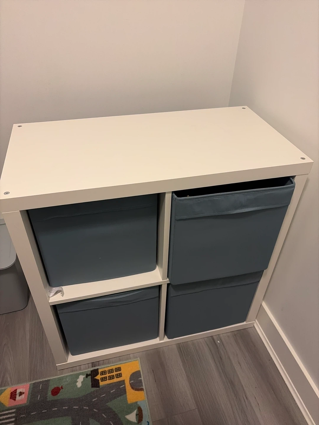 This white IKEA KALLAX storage unit has four cubes, and it comes with four blue fabric bins. It's great for organizing toys, books, or other household items. Use it in a playroom or bedroom for quick tidy-ups!