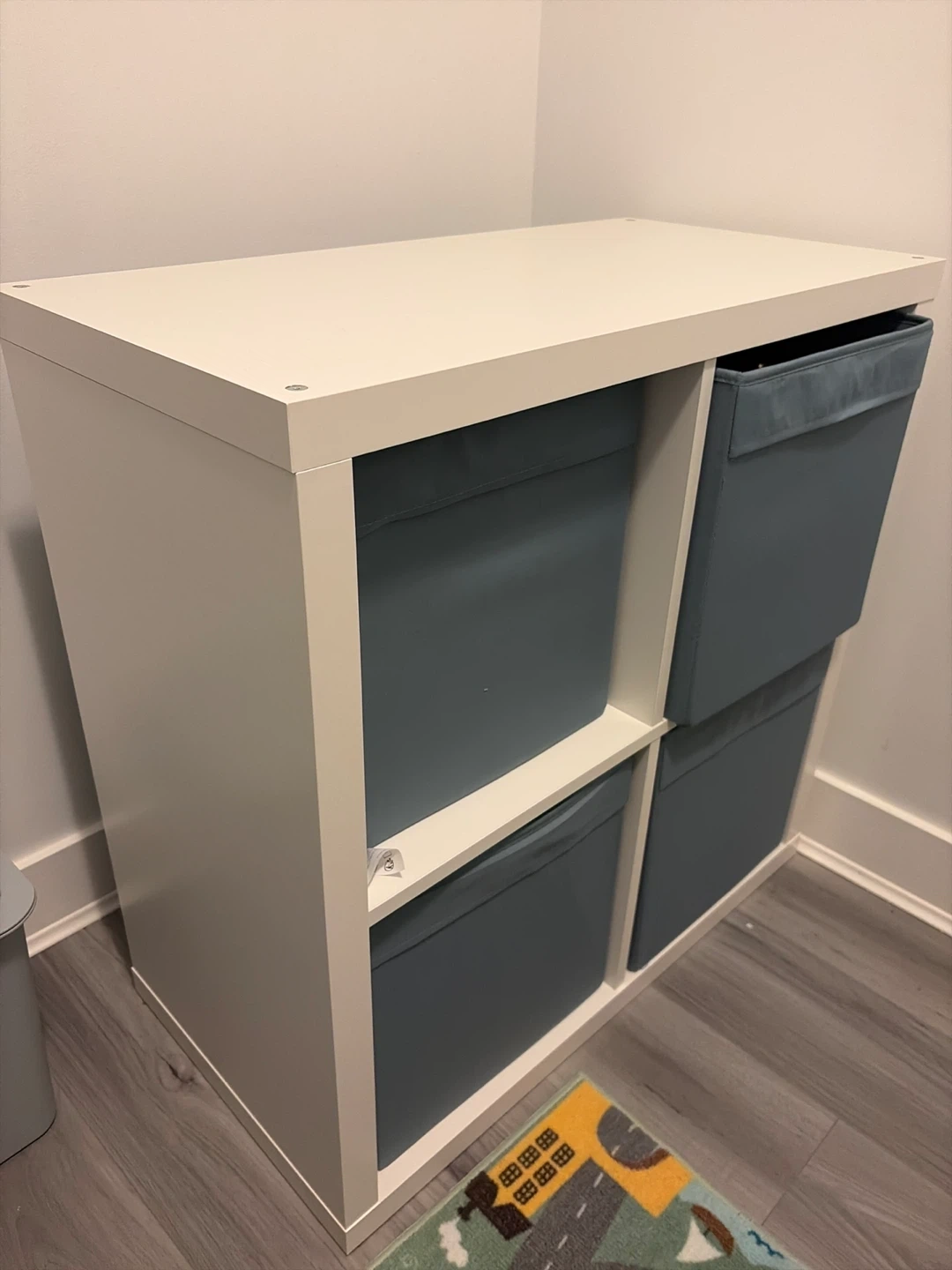This white IKEA KALLAX storage unit has four cubes, and it comes with four blue fabric bins. It's great for organizing toys, books, or other household items. Use it in a playroom or bedroom for quick tidy-ups!
