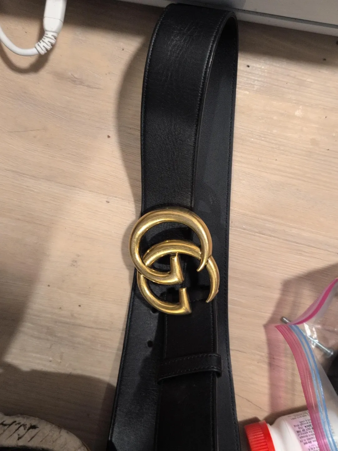 Black leather belt from Gucci featuring the iconic gold GG buckle. Leather material with a smooth finish. This belt is a classic accessory that can elevate any outfit.