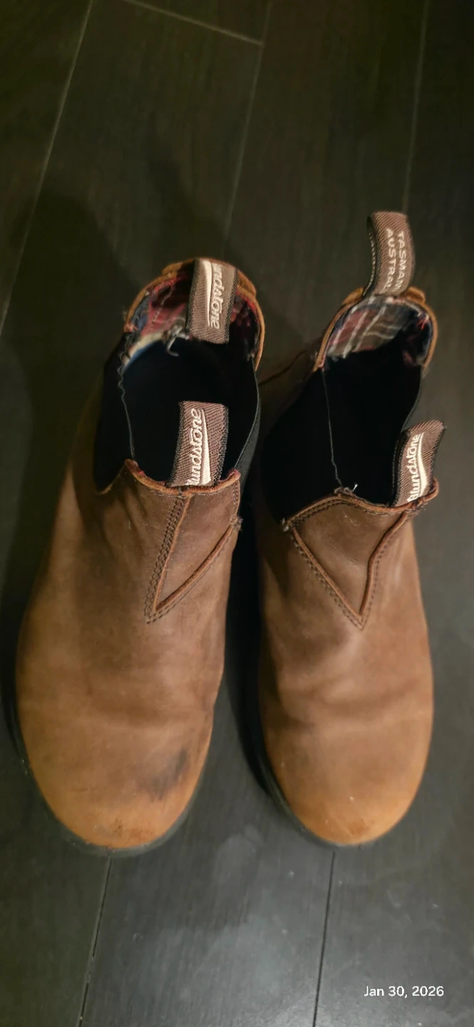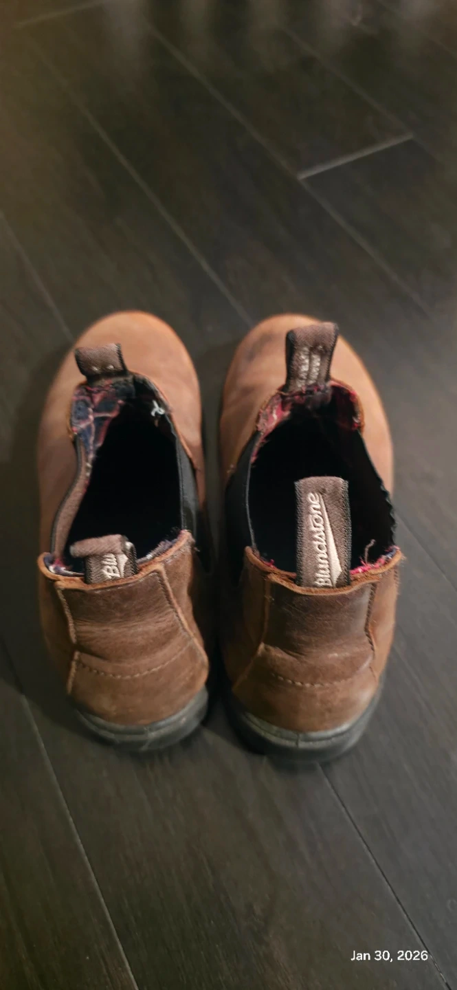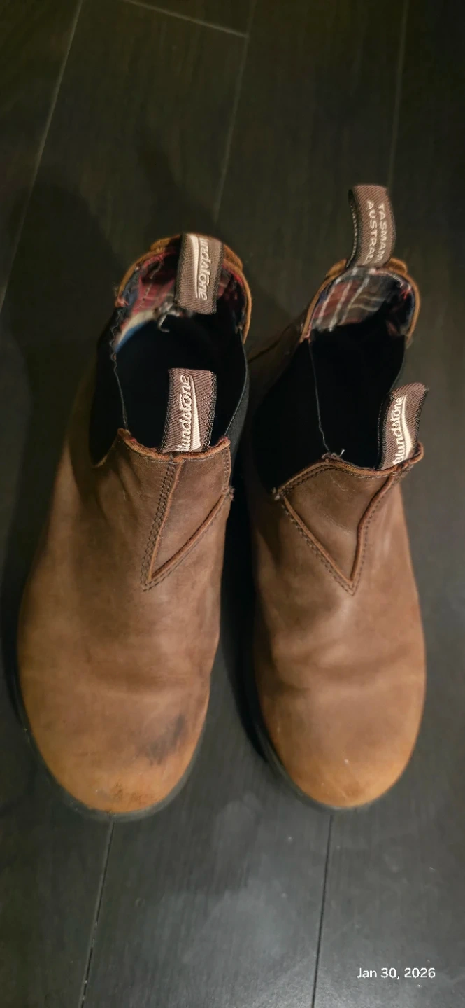 Classic Blundstone Chelsea boots in brown leather. These slip-on boots feature elastic side panels for easy wear. Durable rubber sole.