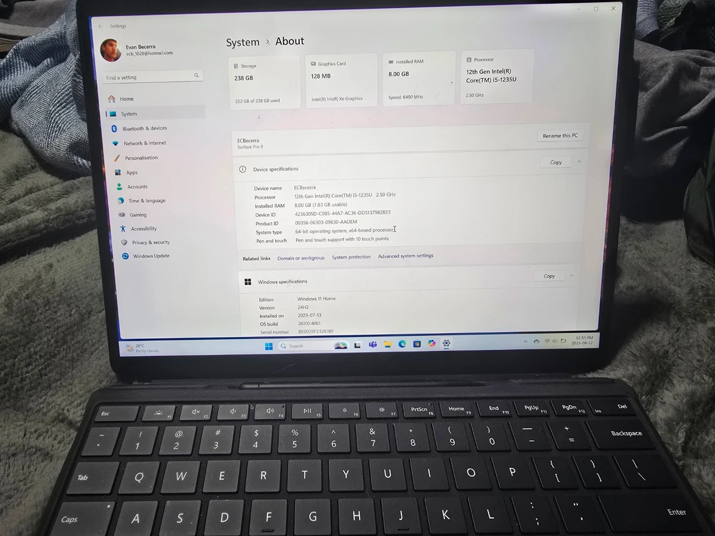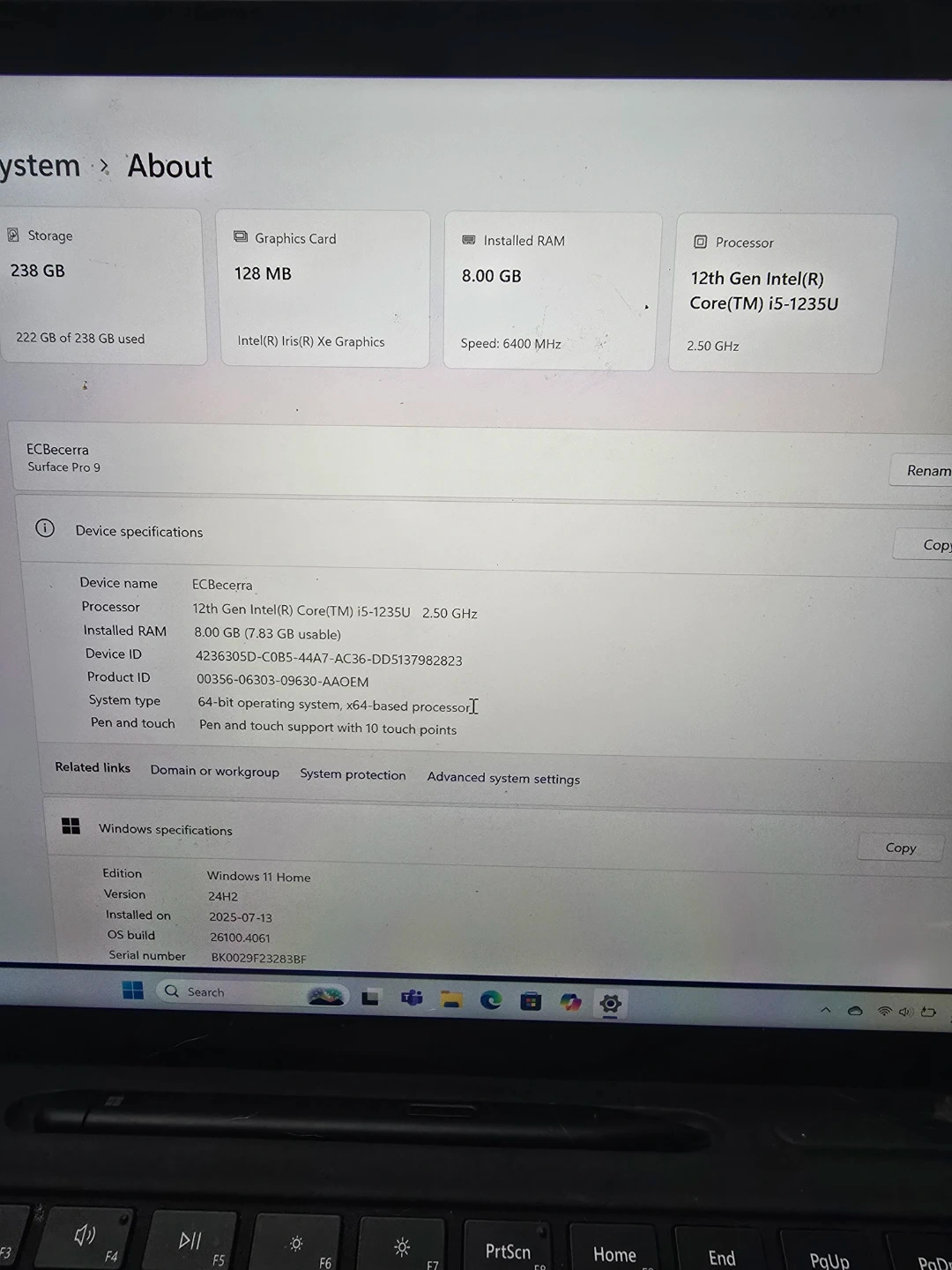 This is a Microsoft Surface Pro 9. It has a 12th Gen Intel(R) Core(TM) i5-1235U processor. It's running Windows 11 Home.