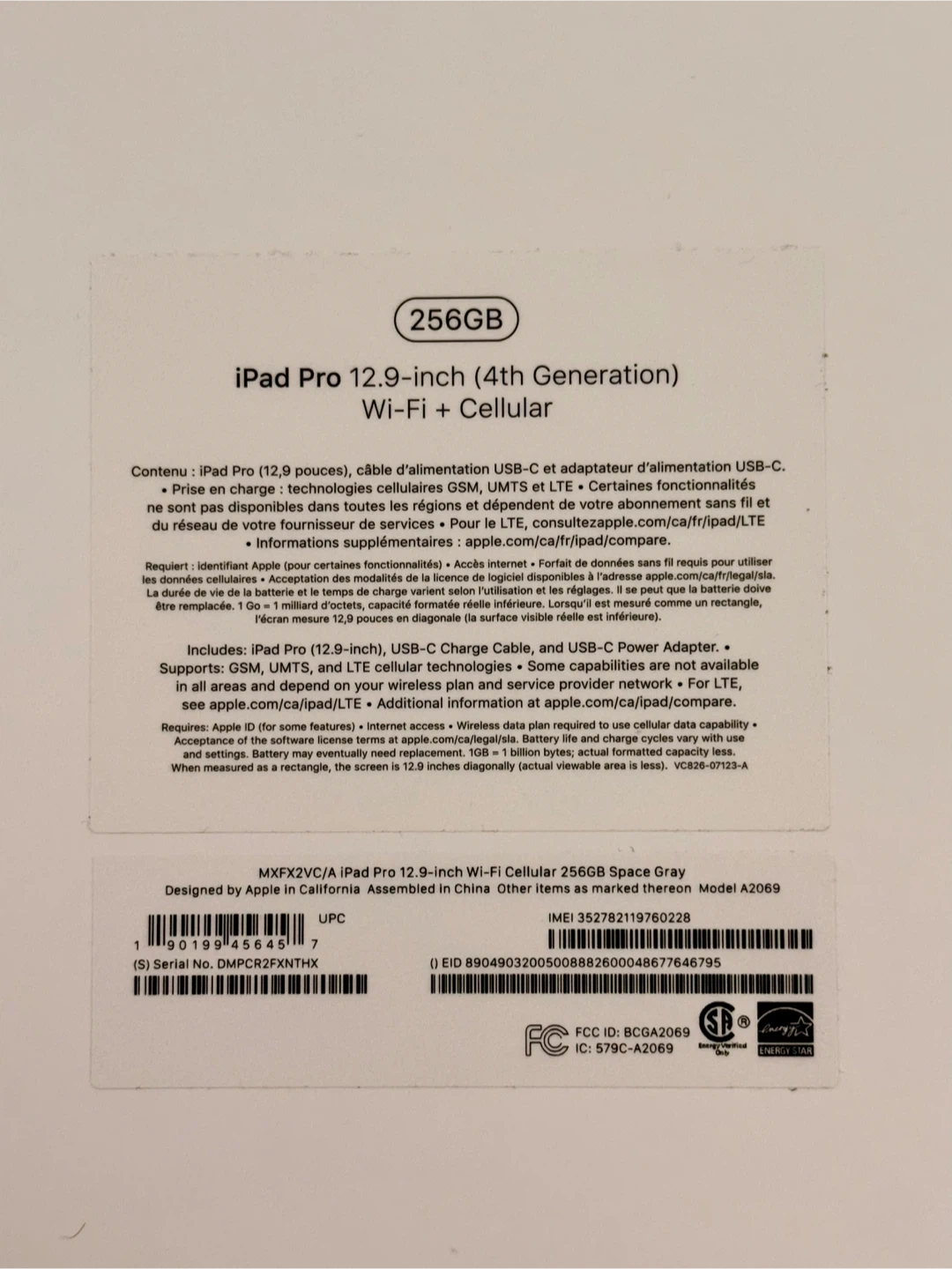 Selling an iPad Pro 12.9” 4th generation, 256GB, Wi-Fi + Cellular model.