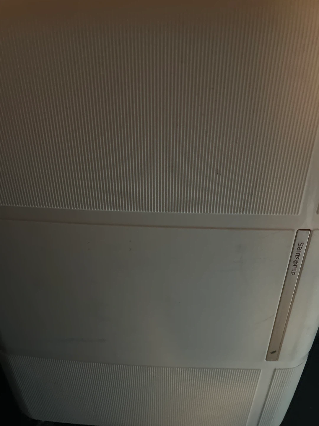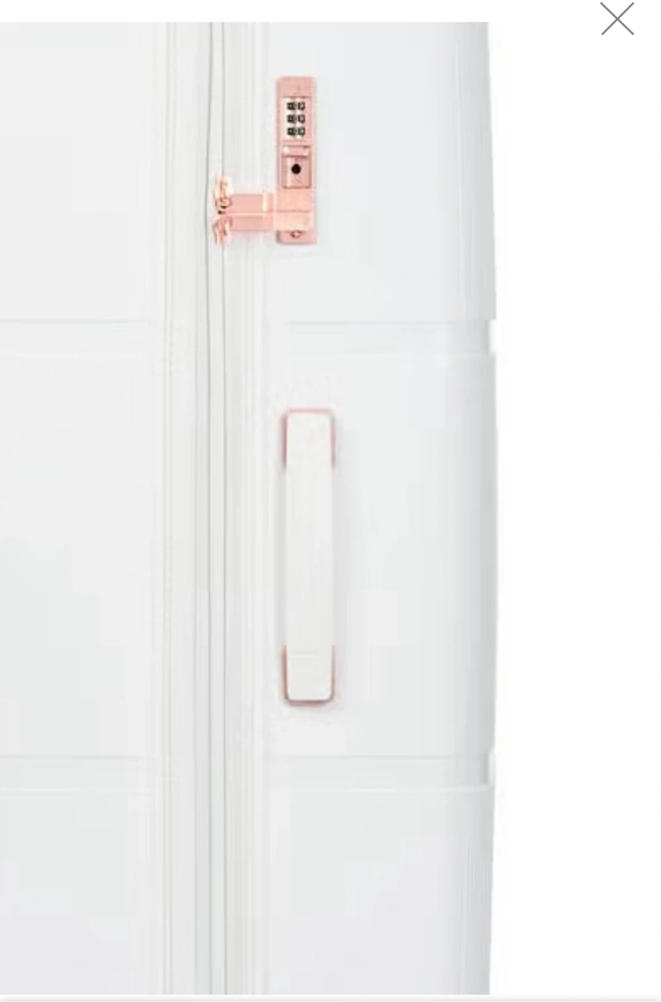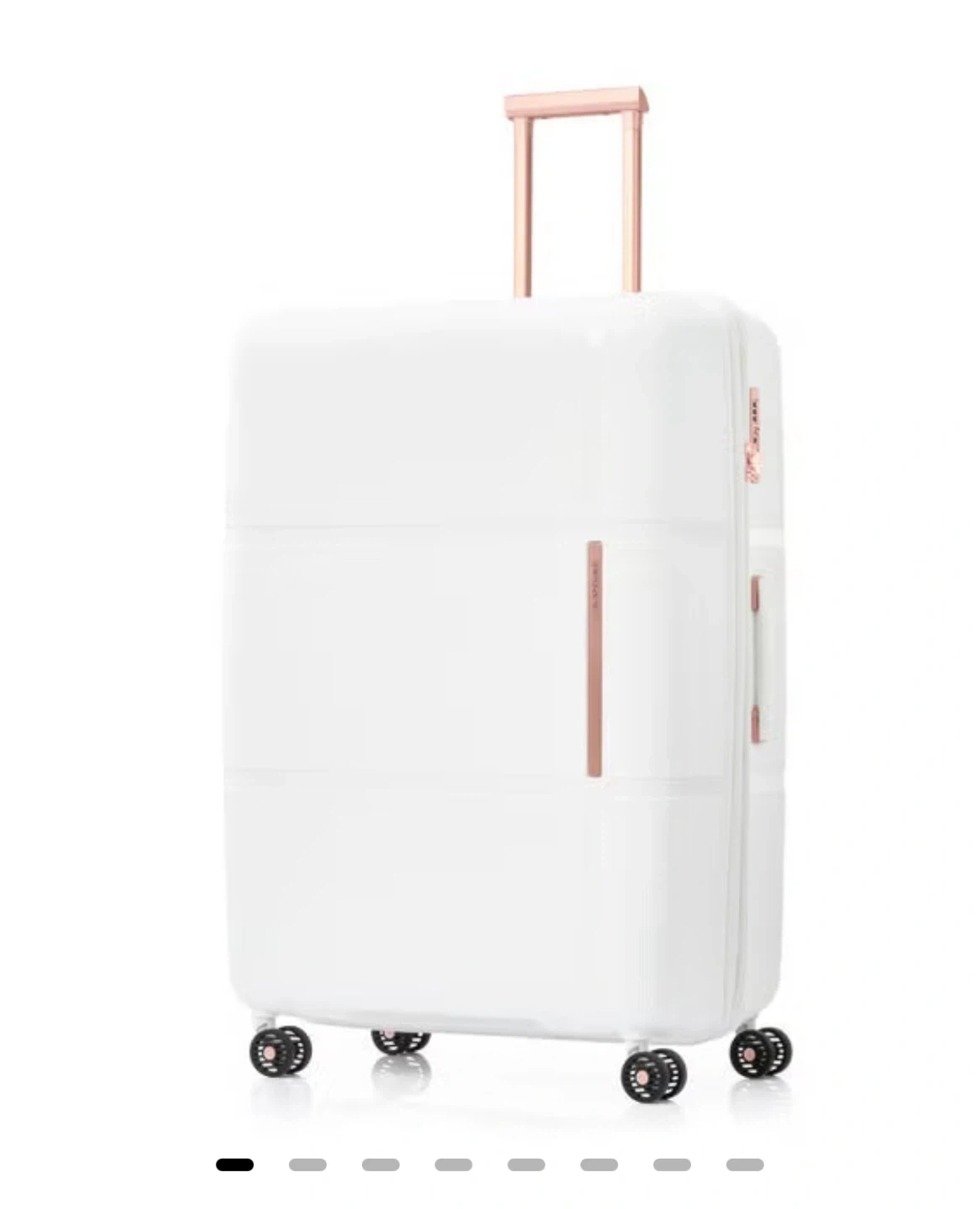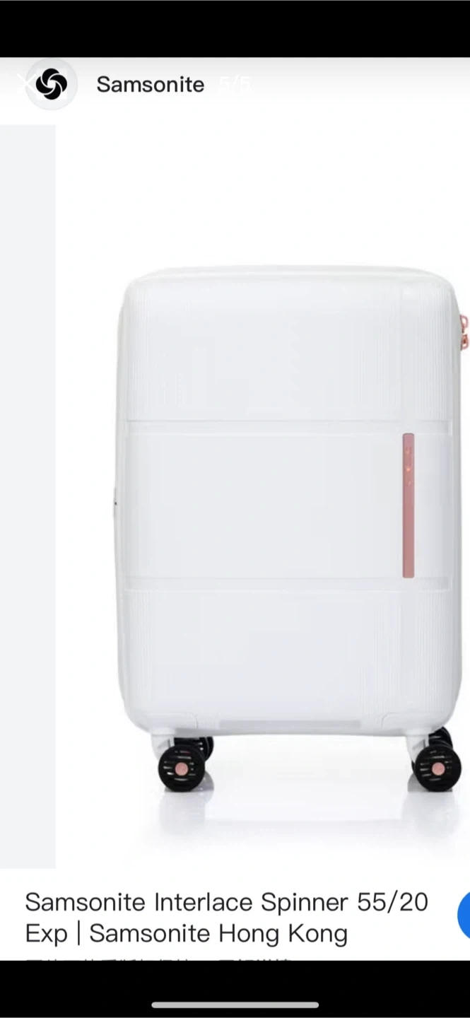 This is a Samsonite Interlace Spinner 55/20 Exp luggage. It's white with rose gold accents. It features spinner wheels and a TSA lock. This luggage is great for weekend trips!