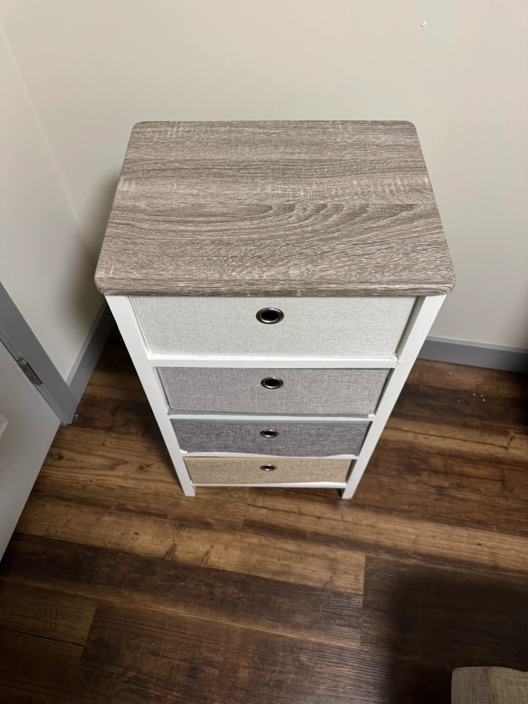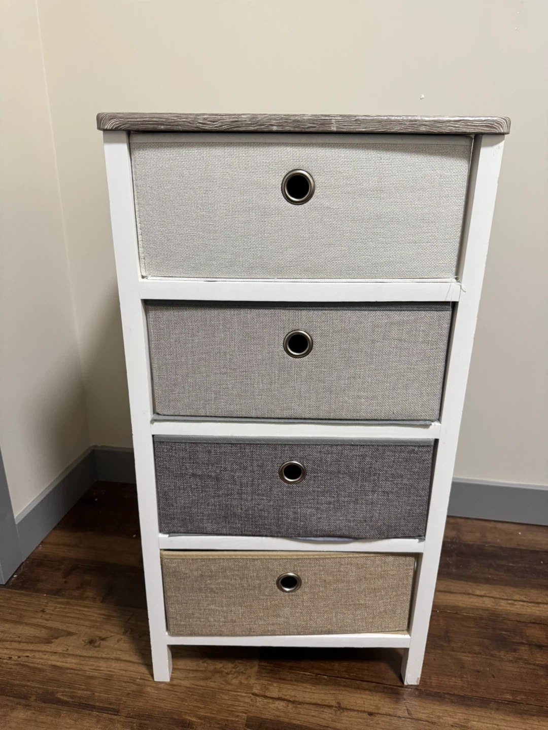 A white 4-drawer storage unit with a wood-effect top. It has fabric drawers in varying shades of grey and beige. This unit's compact design makes it handy for organizing smaller spaces.