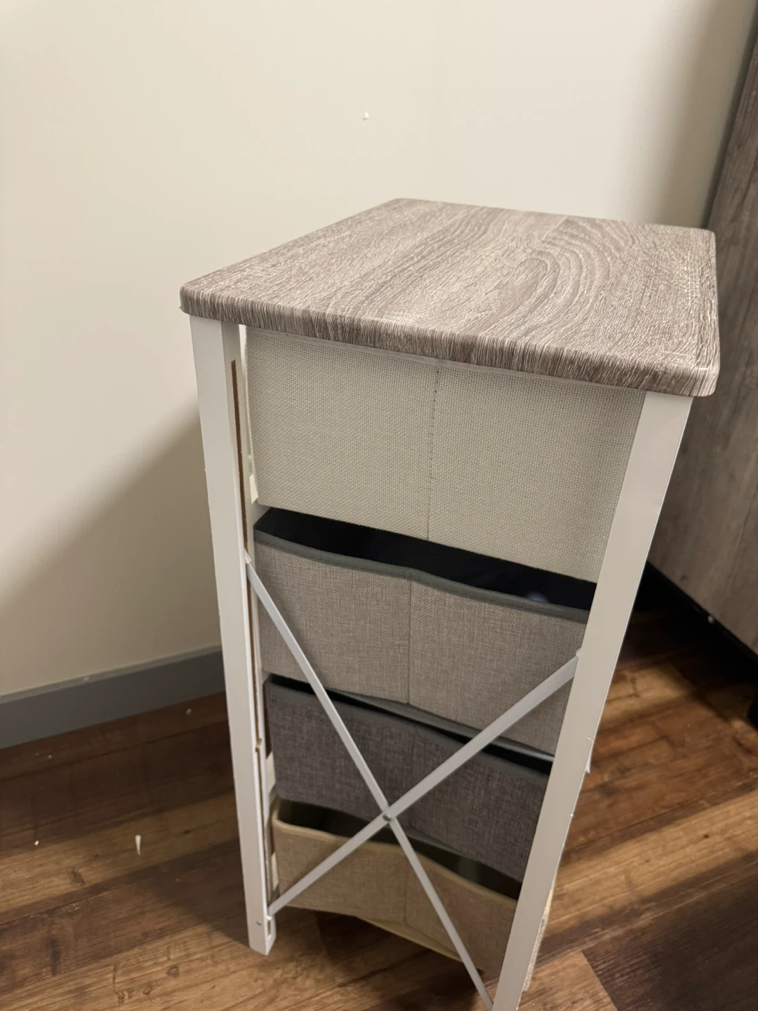 A white 4-drawer storage unit with a wood-effect top. It has fabric drawers in varying shades of grey and beige. This unit's compact design makes it handy for organizing smaller spaces.