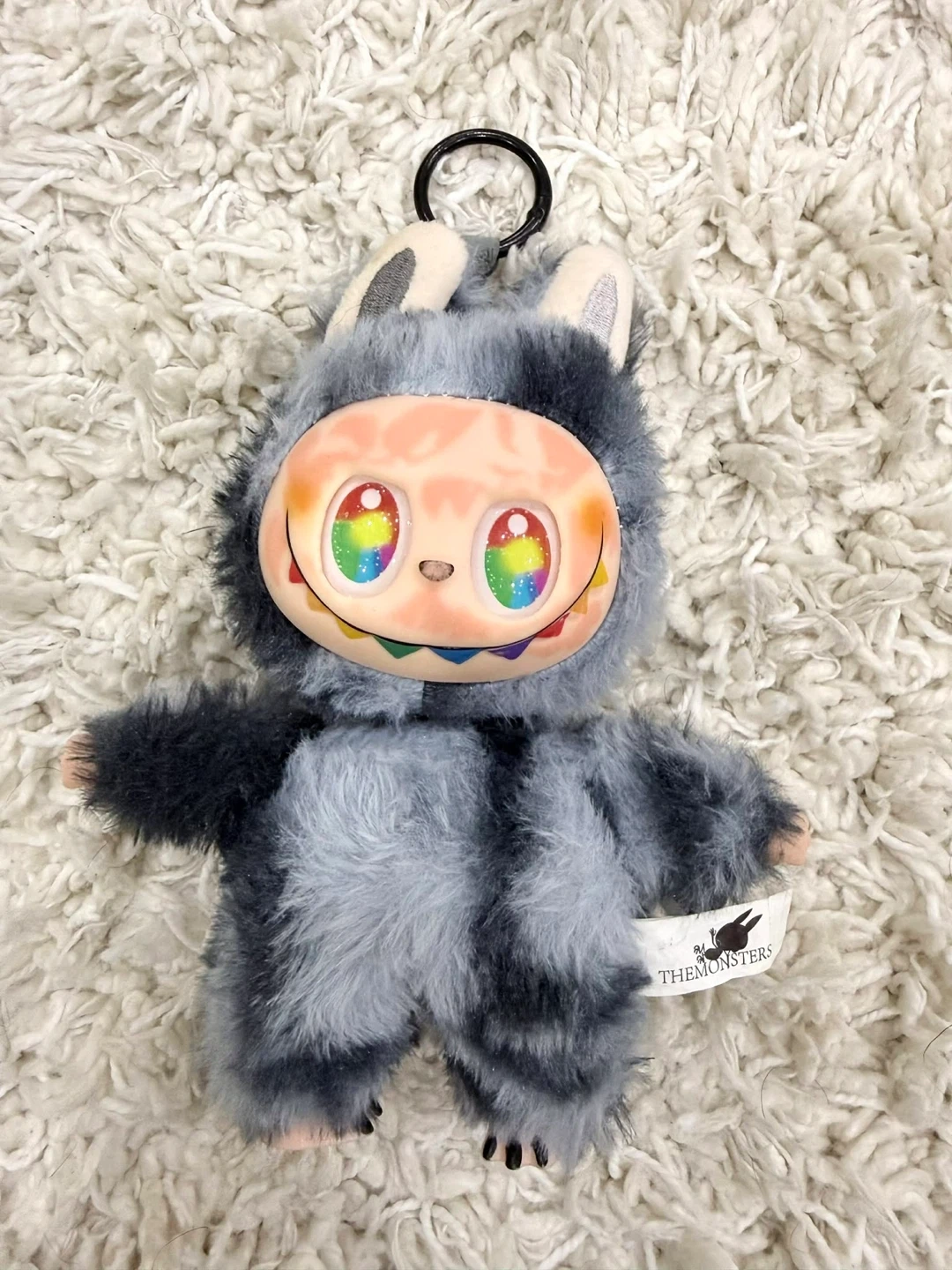 This plush toy keychain features a grey, furry monster character with a distinctive face. It has rainbow-coloured eyes and a smiling mouth. Includes a metal keyring attachment. It's made from soft, plush material.
