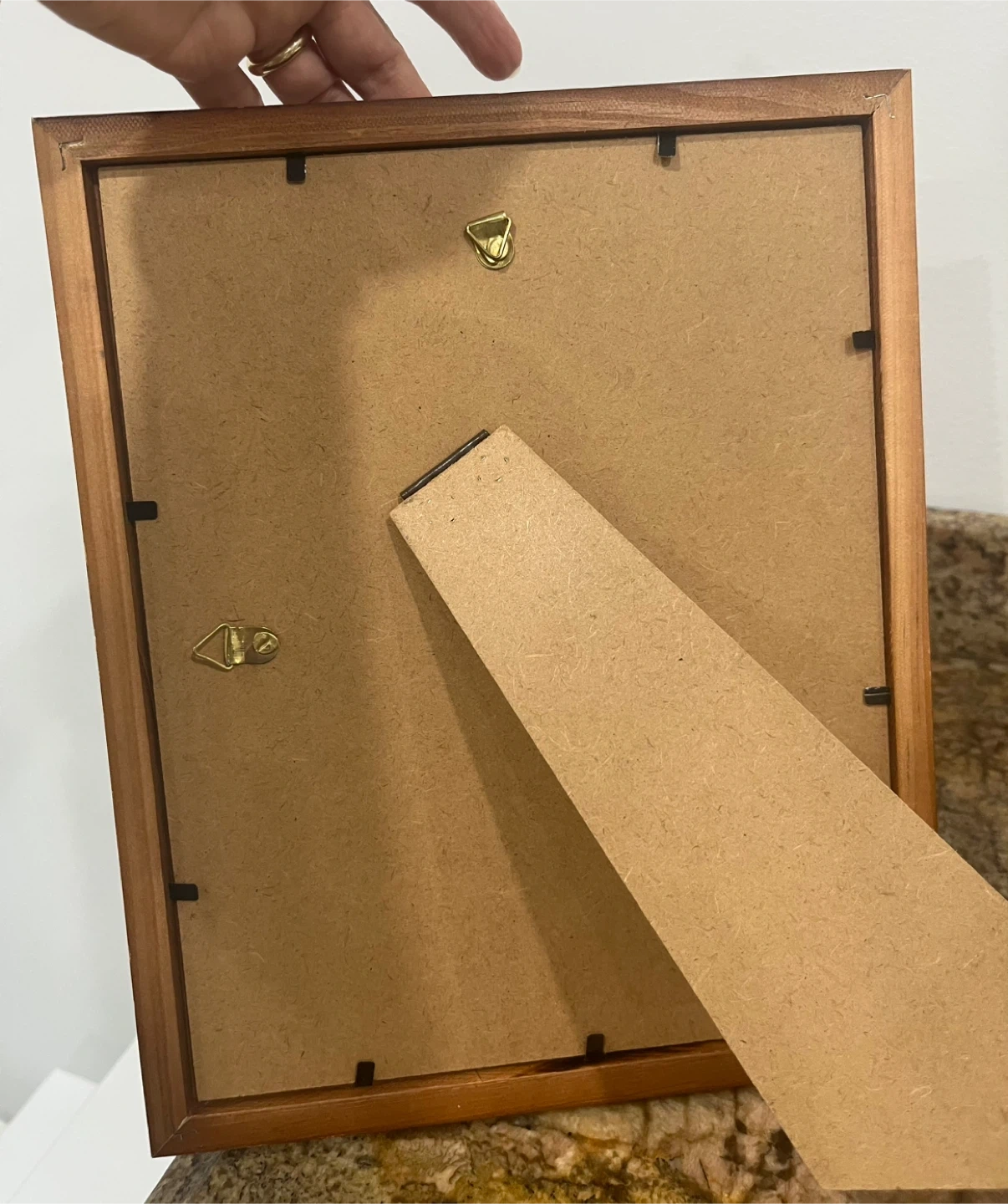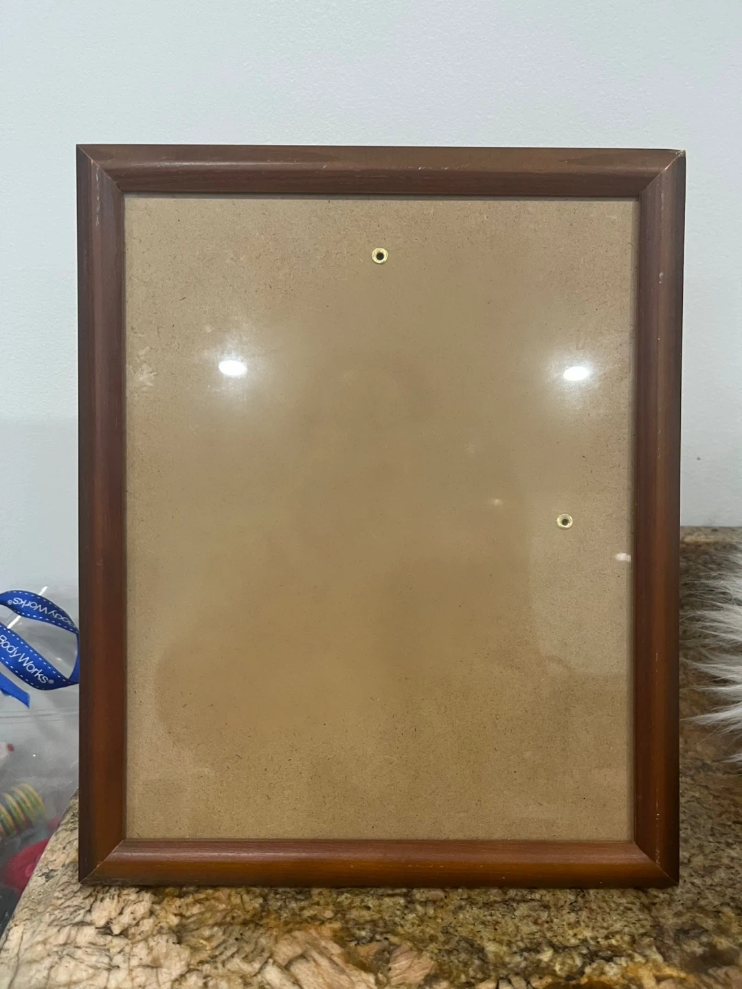 This wooden picture frame is suitable for displaying photos or artwork. It can be stood on a surface or hung on a wall. The frame has a classic dark wood finish.