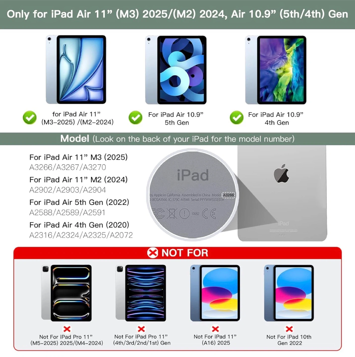 • Device Compatibility: Only compatible with iPad Air 11-inch (M3) 2025, iPad Air 11-inch (M2) 2024, iPad Air 5th Gen 10.9-inch 2022, and iPad Air 4th Gen 10.9-inch 2020.
