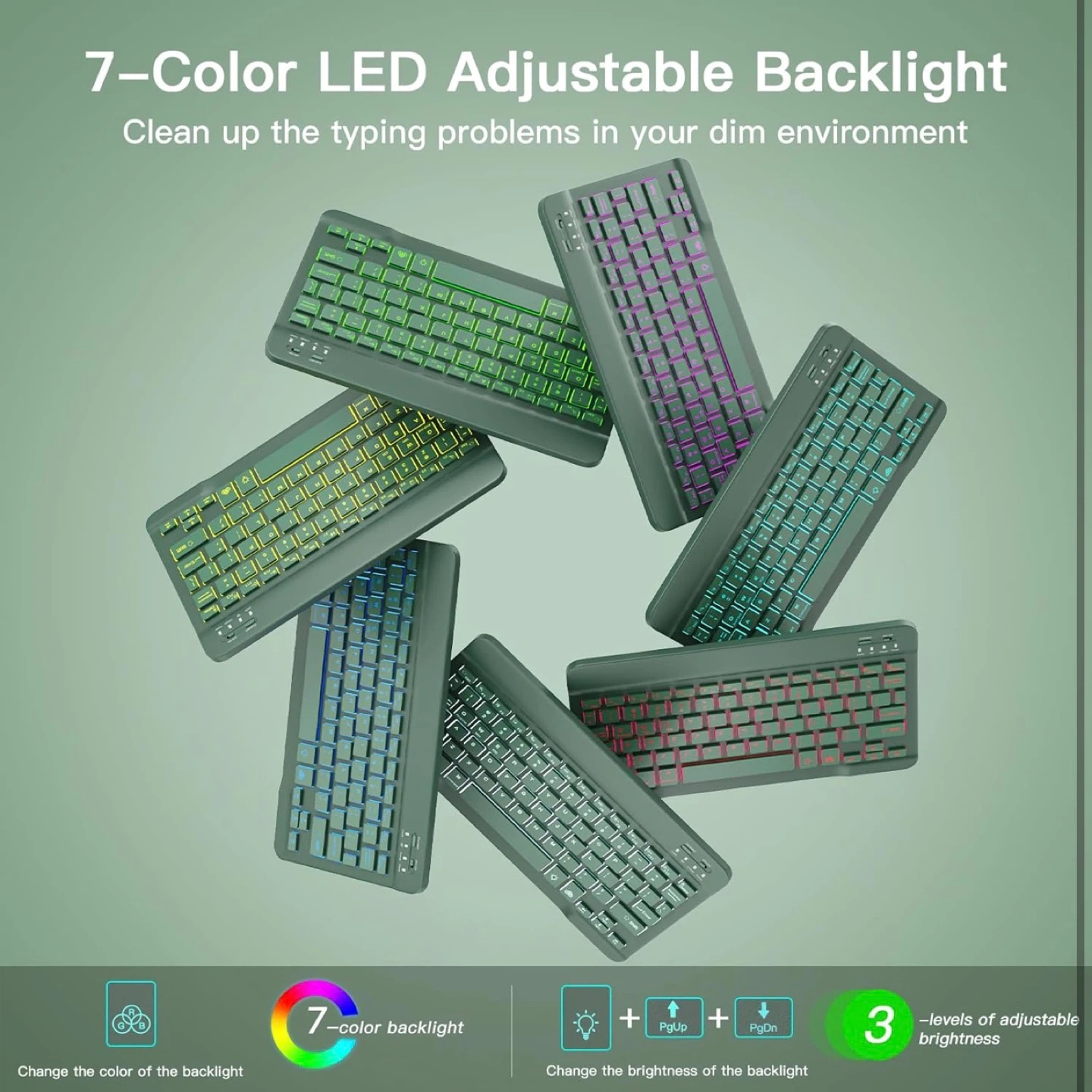 • Keyboard Features: Detachable backlit keyboard with 7 colors and 3-level brightness adjustment, shortcut keys, and a row of keys for volume and brightness control.