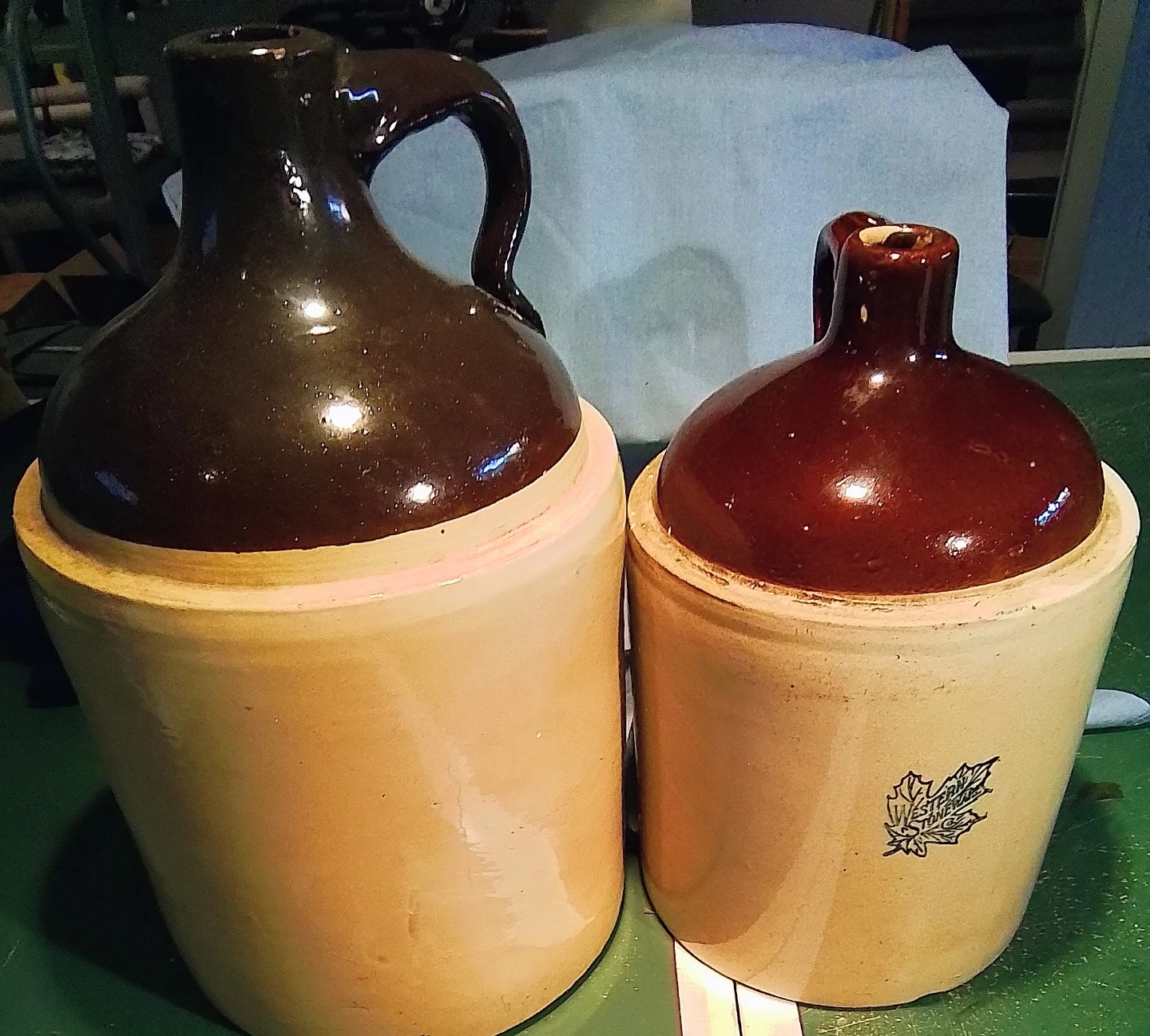 Selling a set of two vintage ceramic jugs. One jug features a dark brown glazed top and handle, while the other has a reddish-brown glazed top. Both jugs have a lighter tan base with a maple leaf emblem on one. They're great for decorative display or storage!