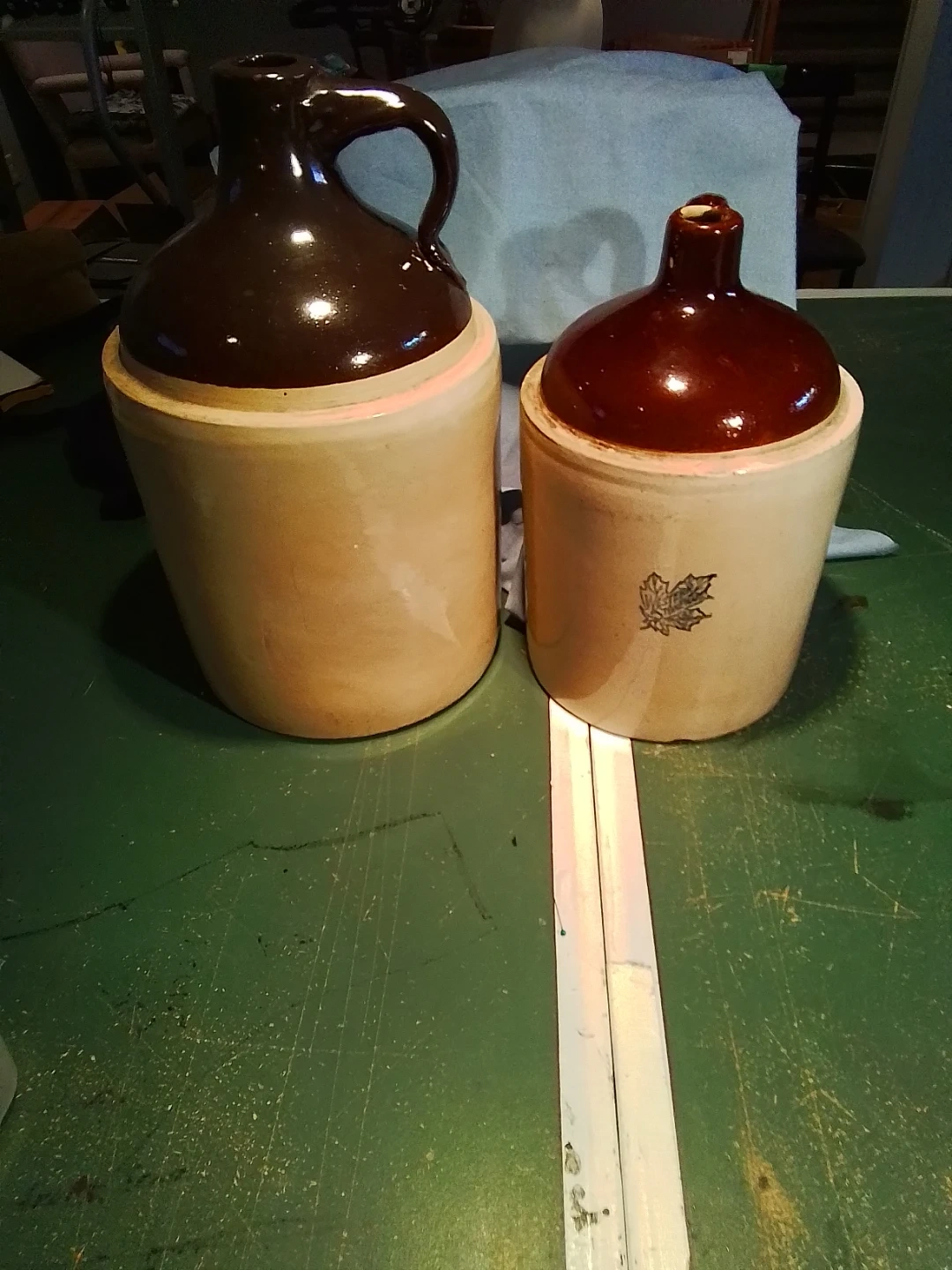 Selling a set of two vintage ceramic jugs. One jug features a dark brown glazed top and handle, while the other has a reddish-brown glazed top. Both jugs have a lighter tan base with a maple leaf emblem on one. They're great for decorative display or storage!