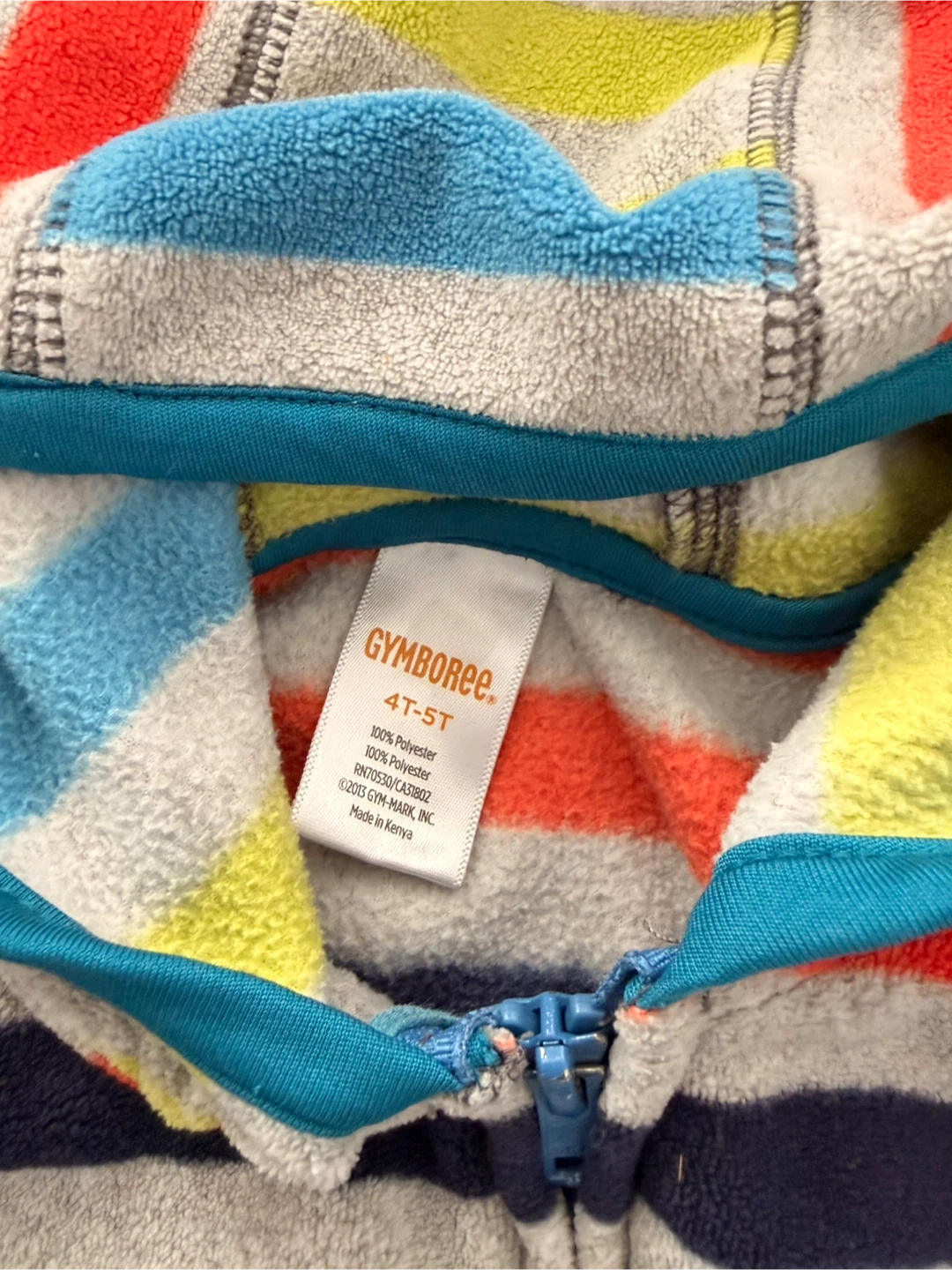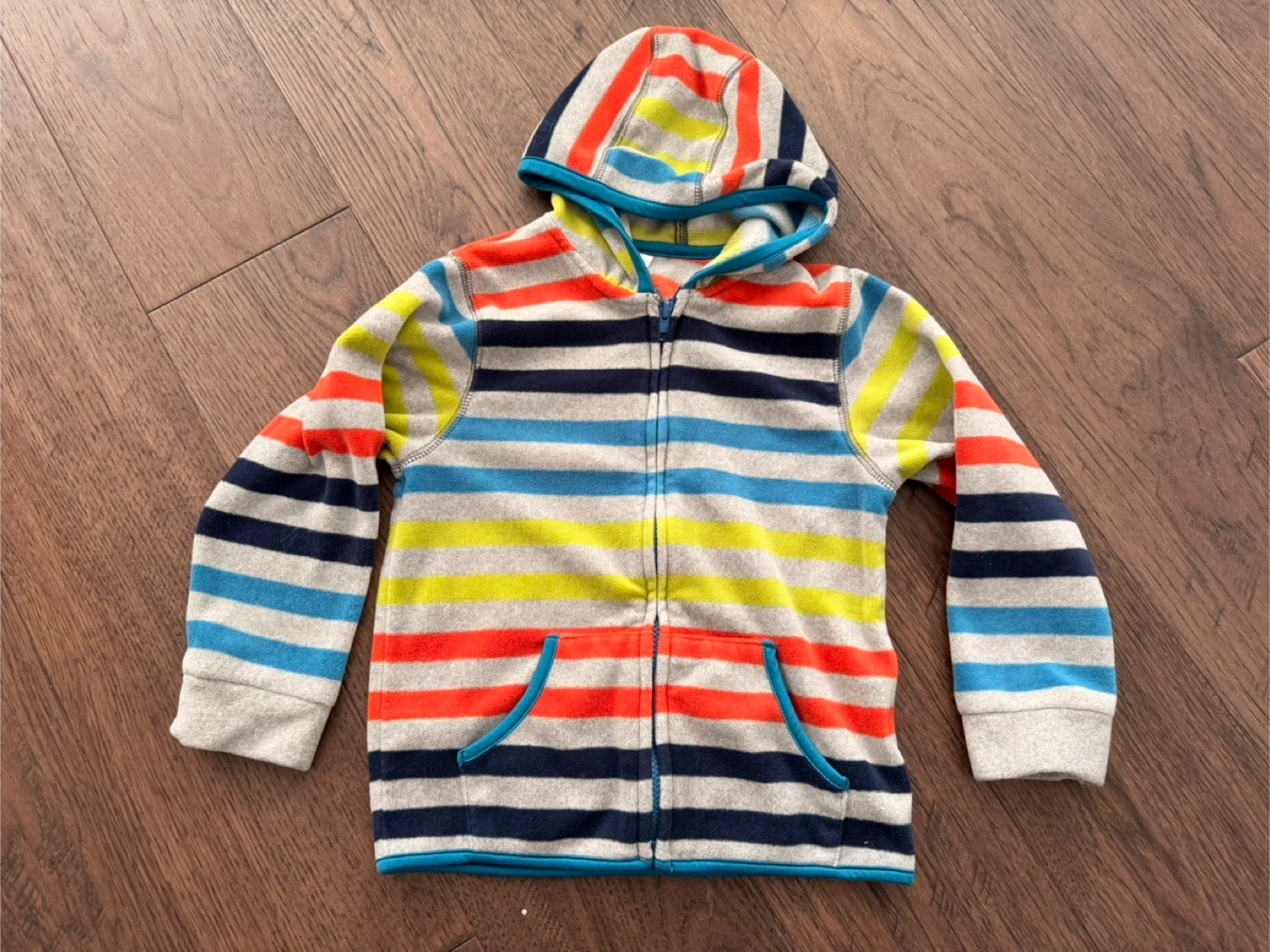 This is a two-piece outfit. It includes a colourful striped fleece zip-up hoodie from Gymboree (size 4T-5T, oversized fit) and navy blue pants from The Children's Place (size 5). The hoodie is one of the softest and most comfortable sweaters from my kiddos closet. Perfect for keeping the little ones warm this winter and great as a light jacket in the spring.