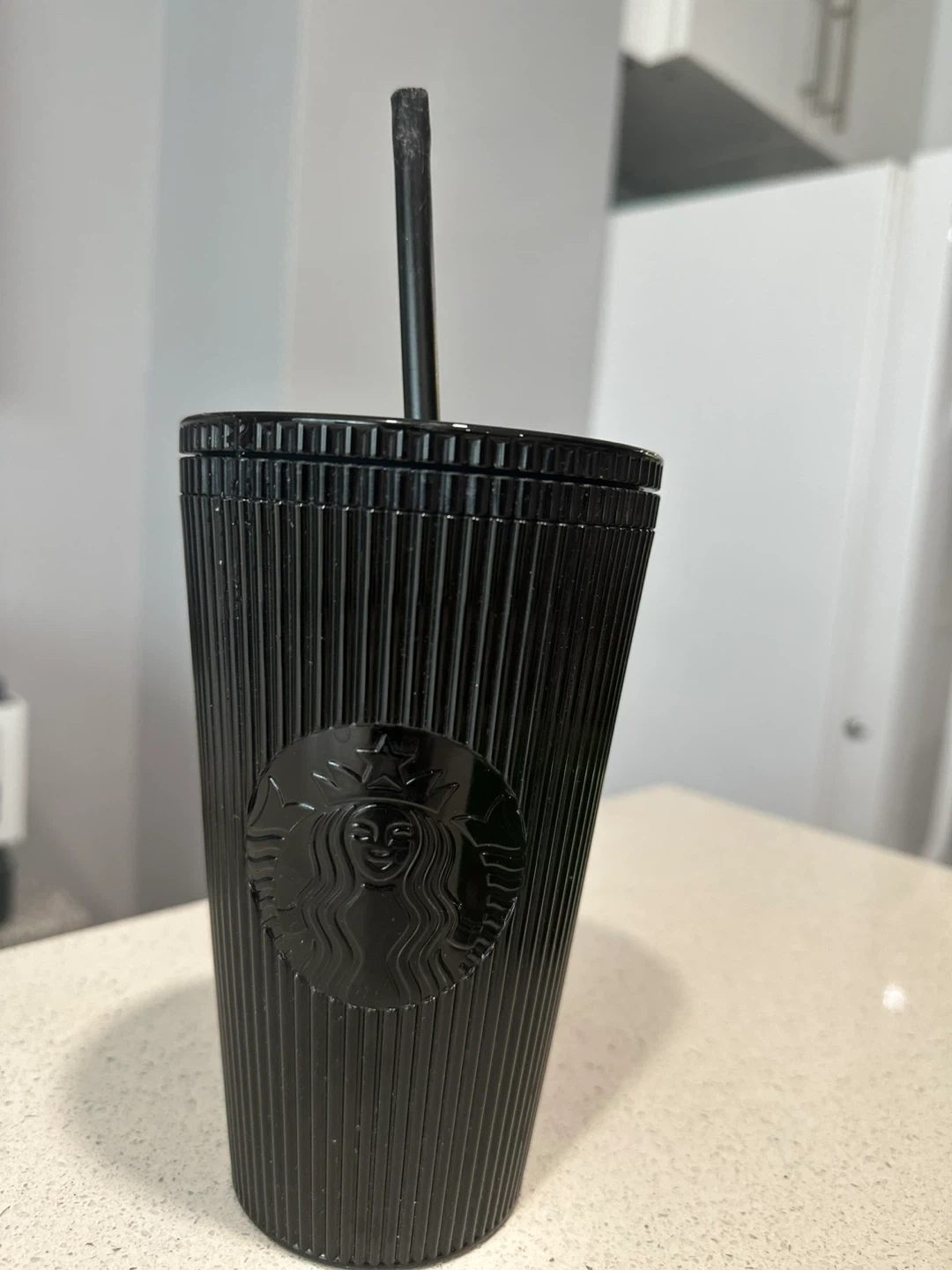 This is a black Starbucks tumbler cup. It comes with a reusable black straw. It's ribbed for grip. Perfect for on-the-go beverages!