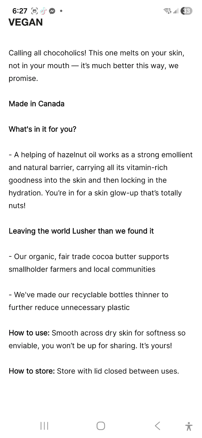 Calling all choco-holics! This body lotion melts on your skin for hydration. It's made in Canada with hazelnut oil and organic, fair trade cocoa butter. Smooth across dry skin for softness you won't want to share. It's yours!