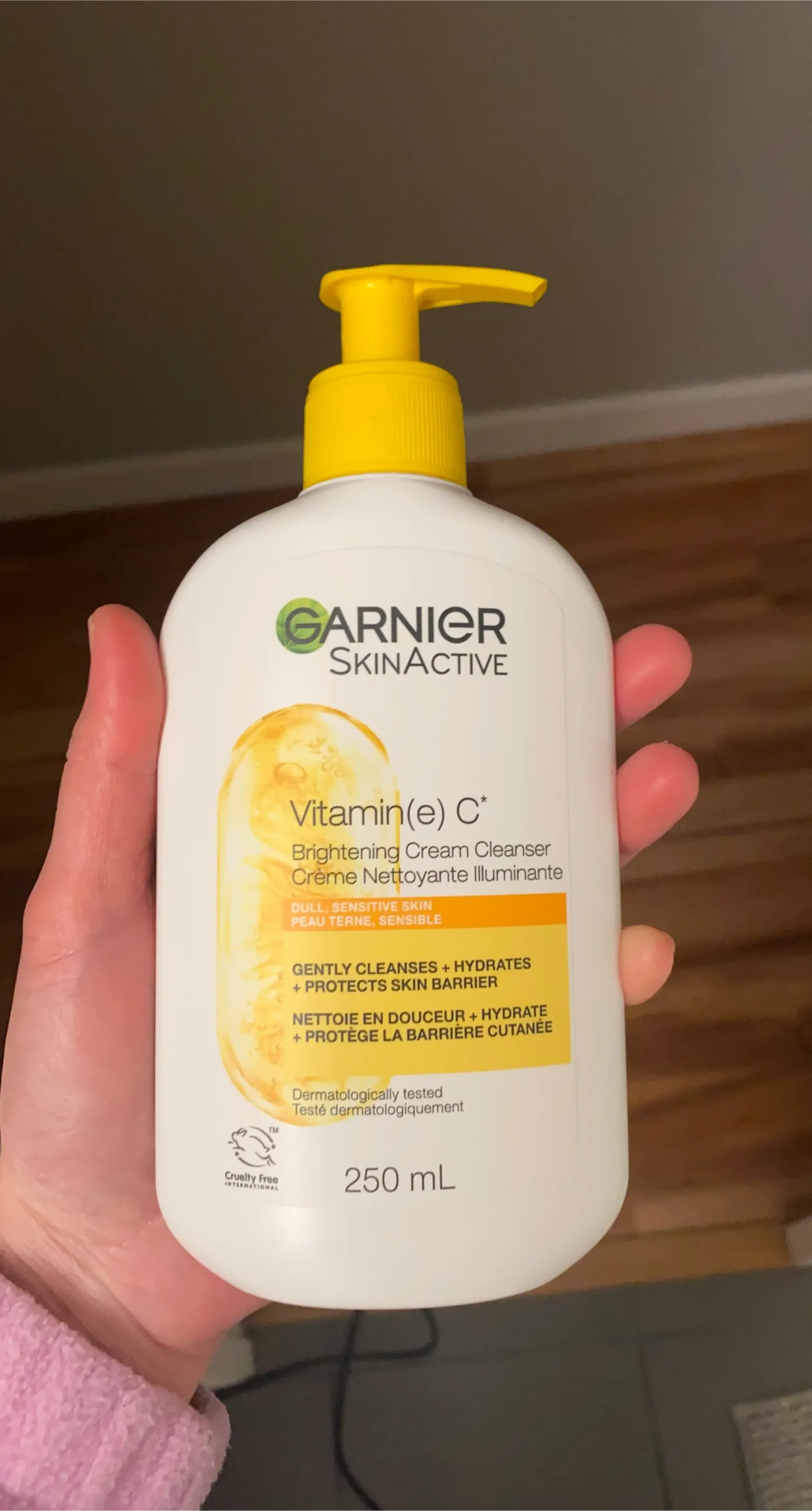 Garnier SkinActive Vitamin E C* Brightening Cream Cleanser. Gently cleanses and hydrates, plus protects skin barrier. Dermatologically tested for dull, sensitive skin. 250 mL bottle.