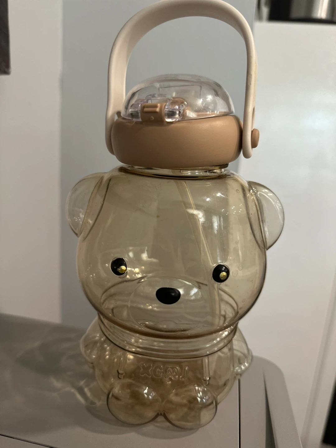 This is a cute bear-shaped water bottle. It has a convenient carry handle and a built-in straw for easy sipping. Made from durable plastic, it's great for kids or anyone who loves fun drinkware!