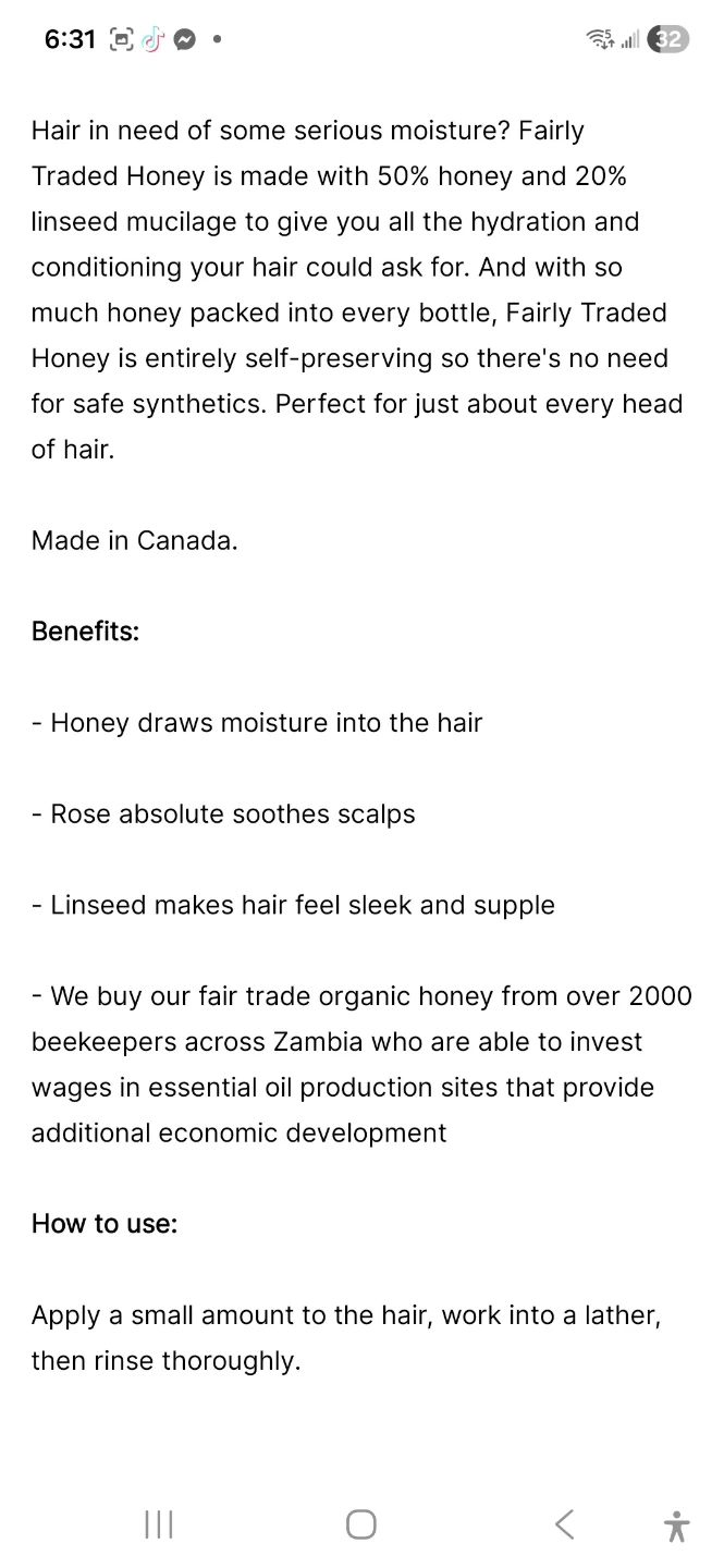 Fairly Traded Honey shampoo is made with 50% honey and 20% linseed mucilage for hydration and conditioning. It's honey-scented and suitable for dry hair. Made in Canada.