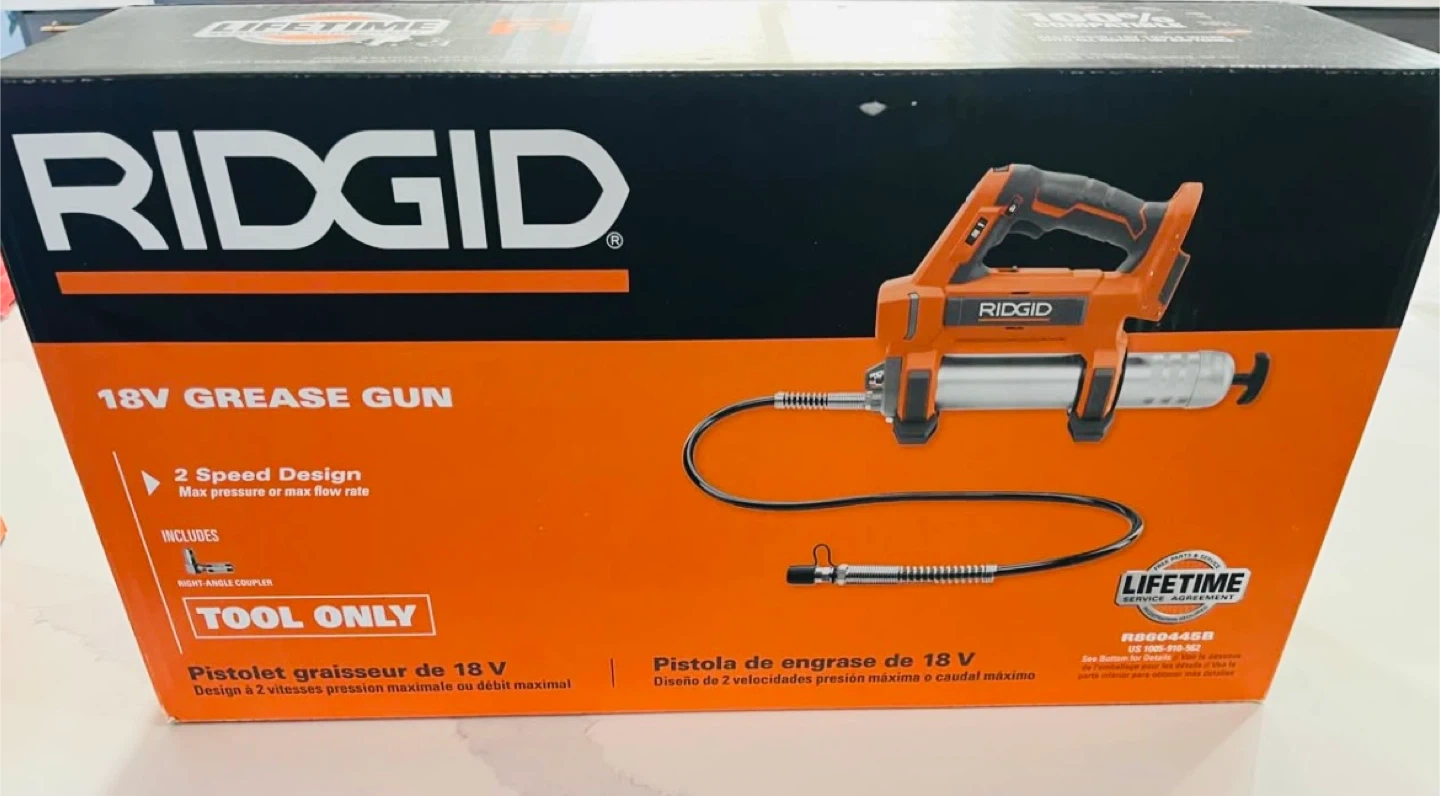 This is a RIDGID 18V grease gun. It features a 2-speed design for max pressure or max flow rate. Includes a right-angle coupler. Tool only.