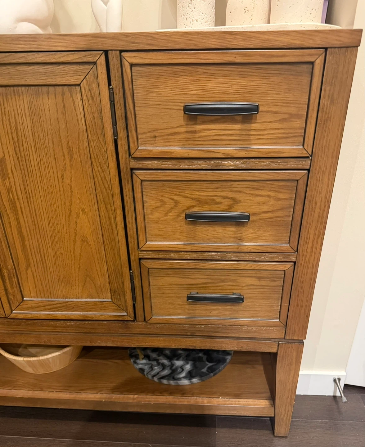 A beautiful wooden sideboard with double doors and multiple drawers for storage. It's made of solid wood with a warm, natural finish. This piece offers ample space for organizing various items. It is 143 cm x 46 cm. It’s brand is Property Brothers.