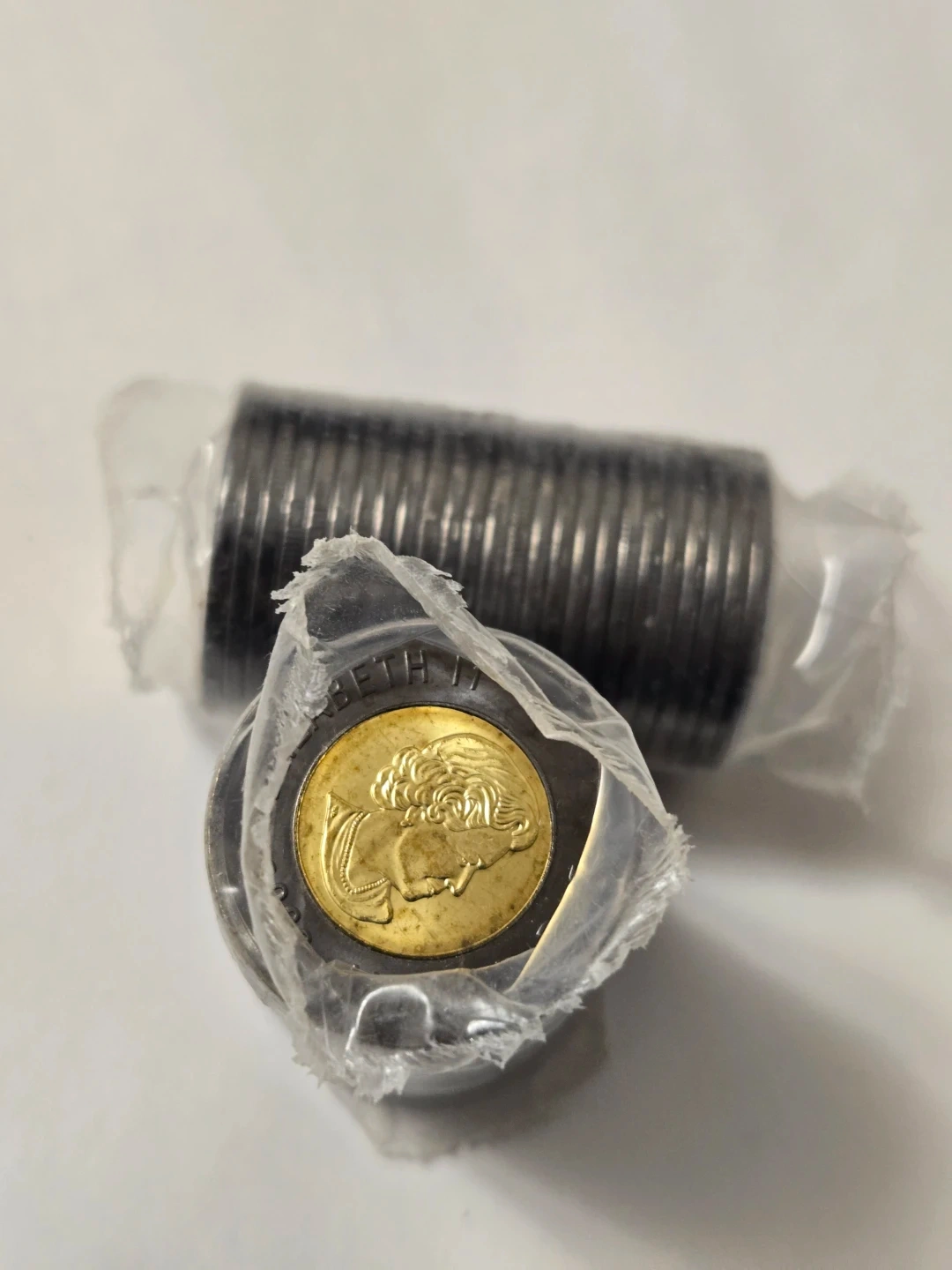Here's a roll of Canadian two-dollar coins, also known as Toonies. Each coin features Queen Elizabeth II on one side and the traditional polar bear on the other. These coins are standard currency and are ready for circulation or collection.