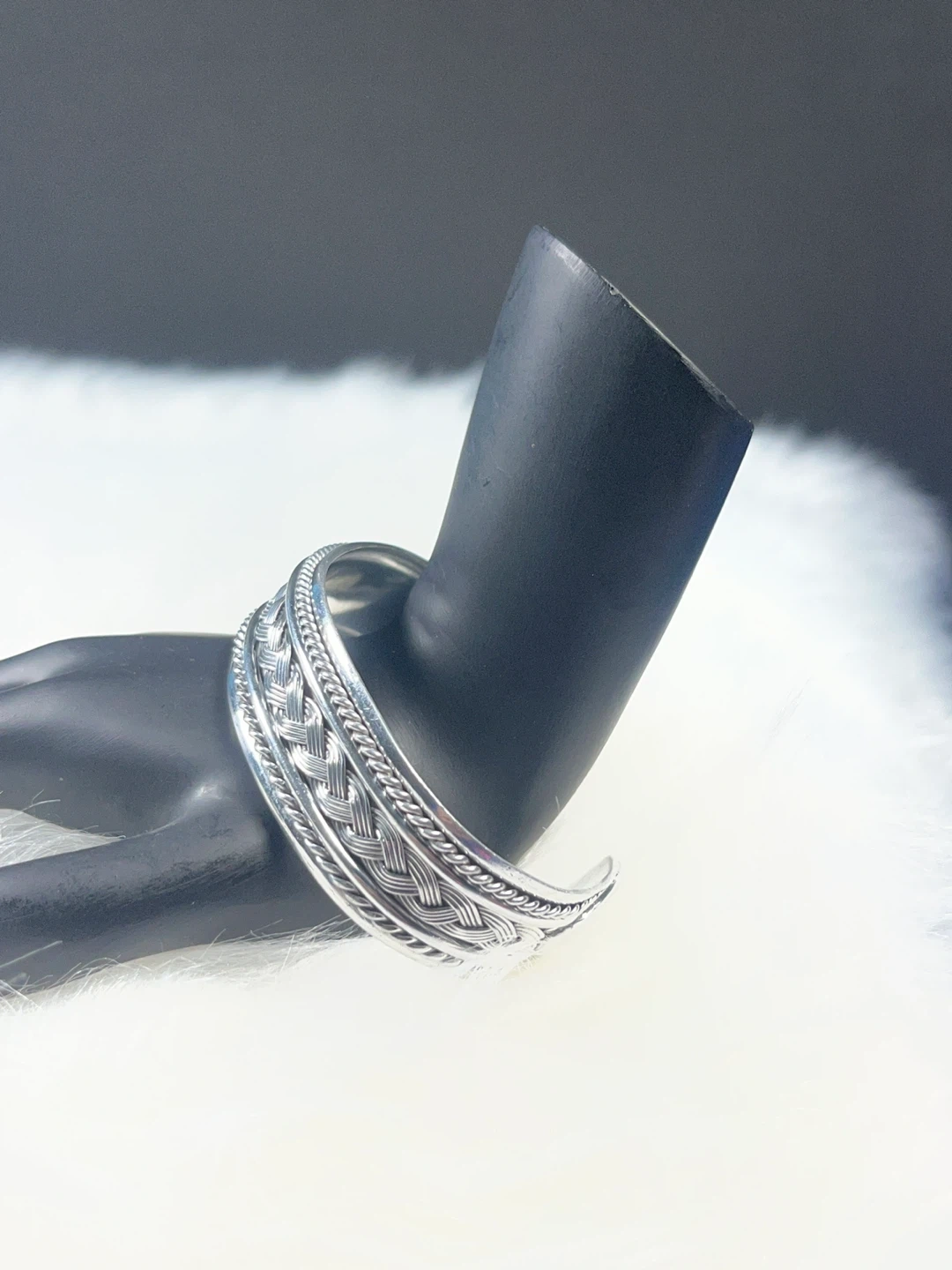 This silver-tone cuff bracelet features intricate braided detailing with rope-like trim. It's a stylish accessory for any occasion. A great way to add some flair to your outfit!