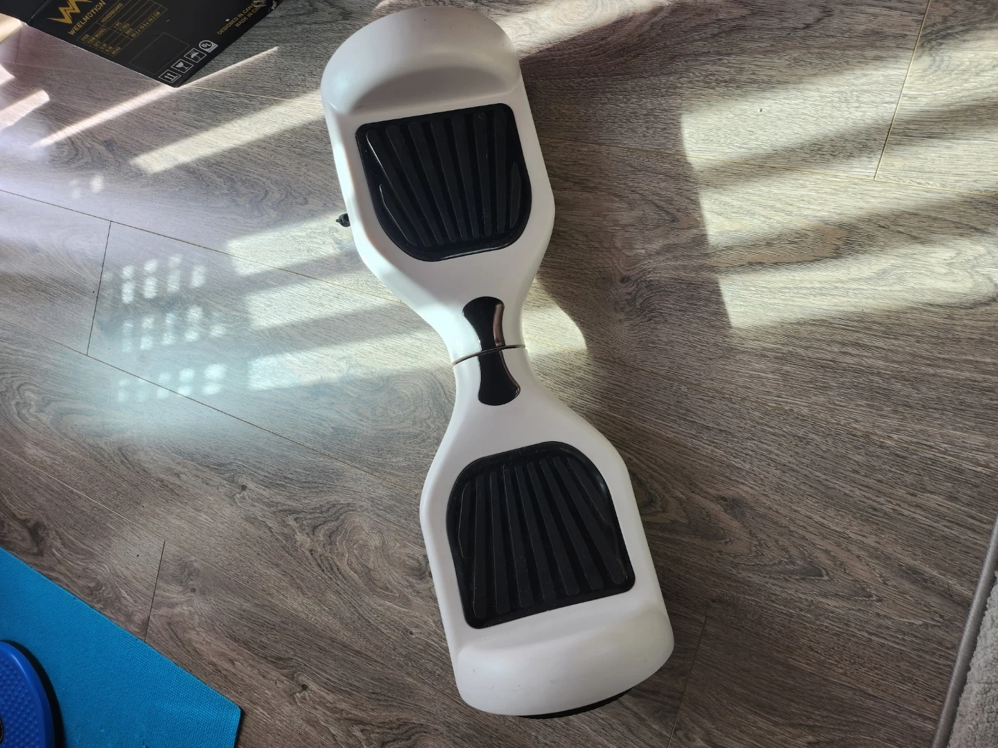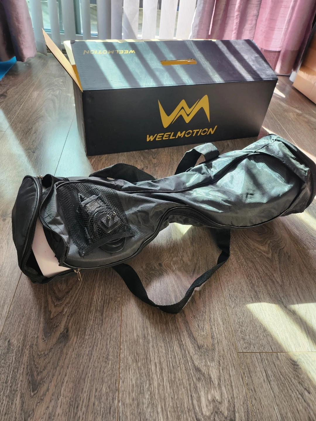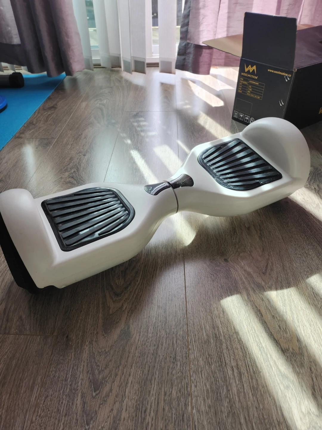 This is a white WEELMOTION hoverboard. It comes with a black carry bag and its original box. Includes charger. It also includes a Bluetooth feature so you can listen to music while riding😎