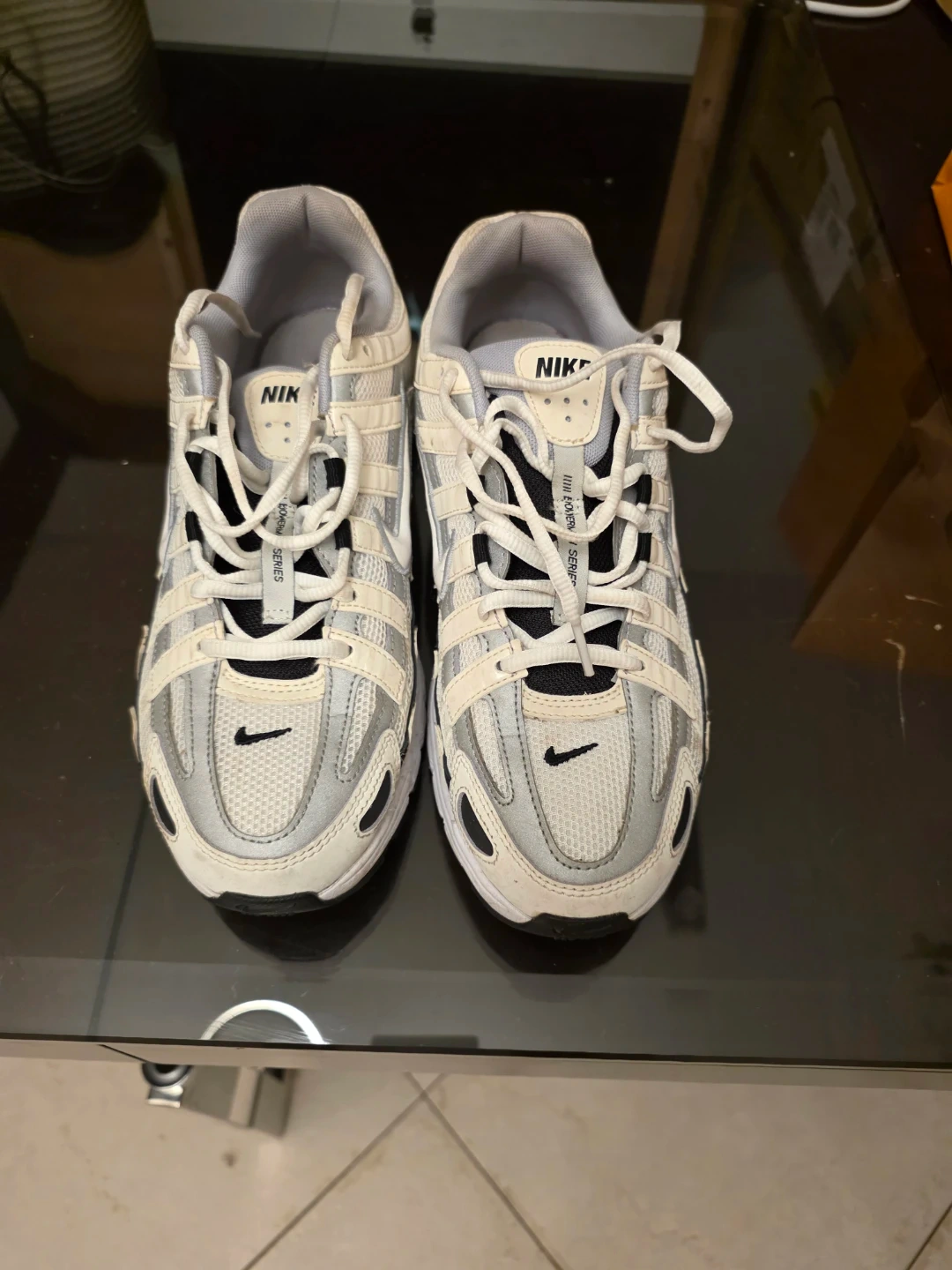 Nike P-6000 sneakers in white, silver, and black. These athletic shoes feature a comfortable design suitable for everyday wear. They have a durable rubber sole and a breathable mesh upper.