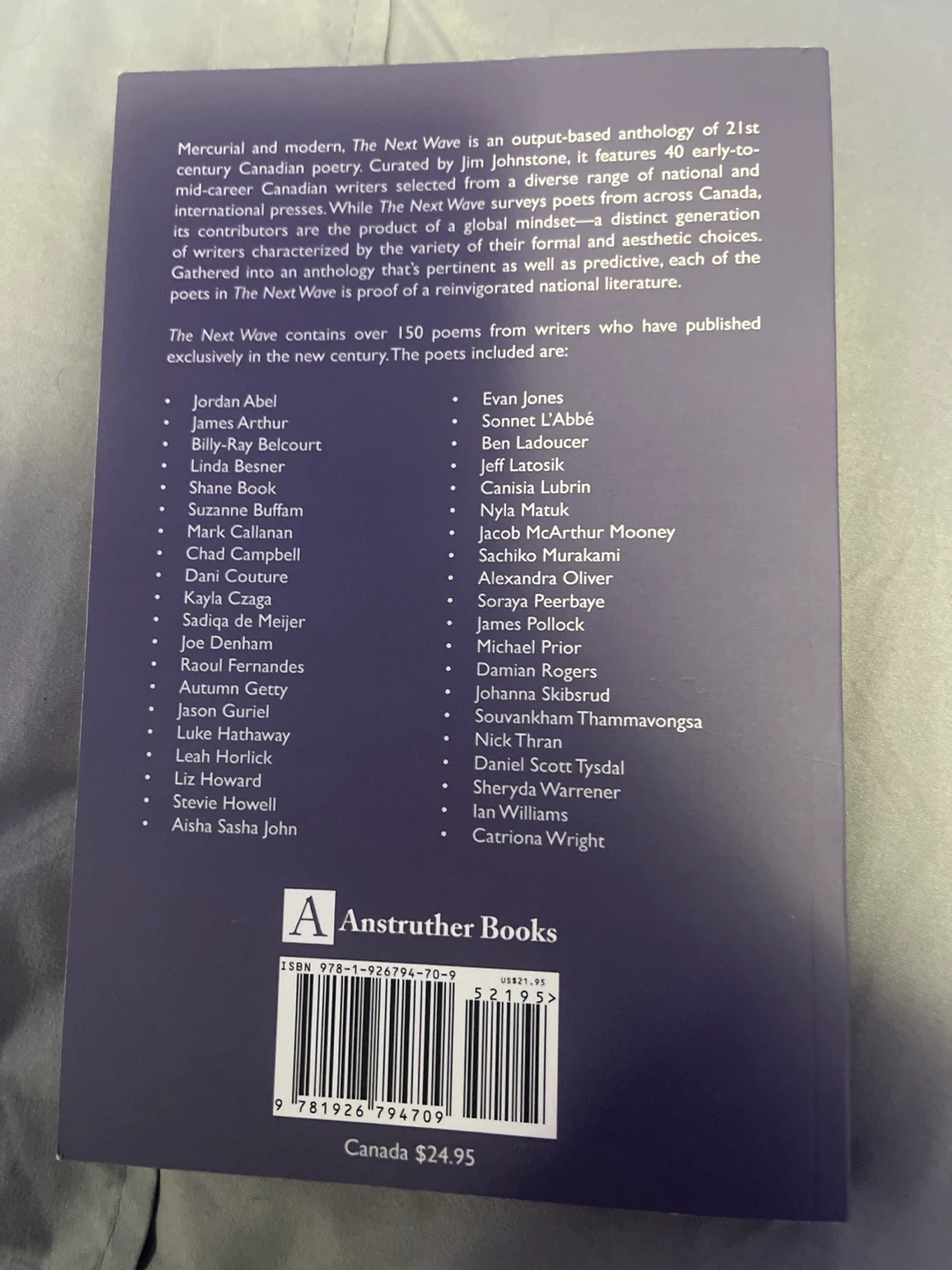 This book is an output-based anthology of 21st century Canadian poetry, curated by Jim Johnstone. It features 40 early-to-mid-career Canadian writers selected from a diverse range of national and international voices. The Next Wave surveys poets from across Canada, its contributors are the product of a global mindset—a distinct generation of writers characterized by the variety of their formal and aesthetic choices. Gathered into an anthology that's pertinent as well as predictive, each of the poets in The Next Wave is proof of a reinvigorated national literature. Over 150 poems from writers who have published exclusively in the new century are included. The original price was $24.95.