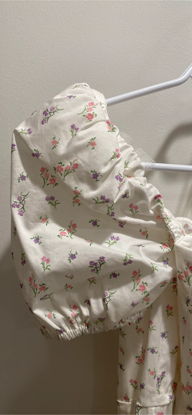 It's the Valeria midi dress from House of CB in white with a pastel floral print. Features puff sleeves, a sweetheart neckline with tie detail, and a high slit. Size XS. New with tags