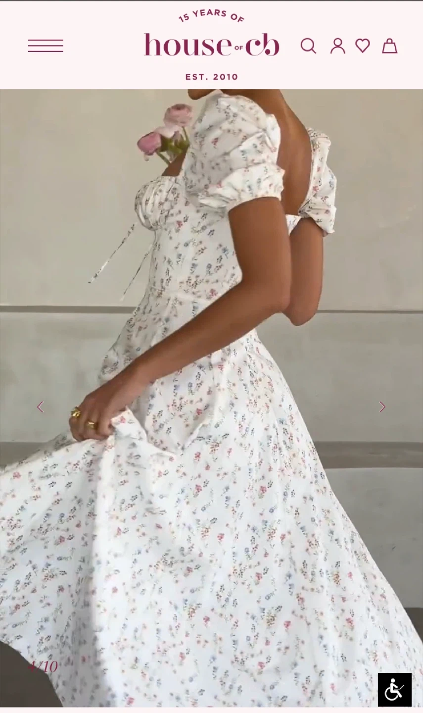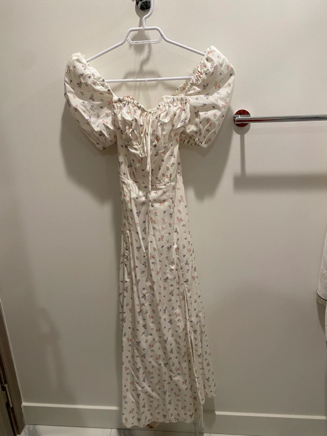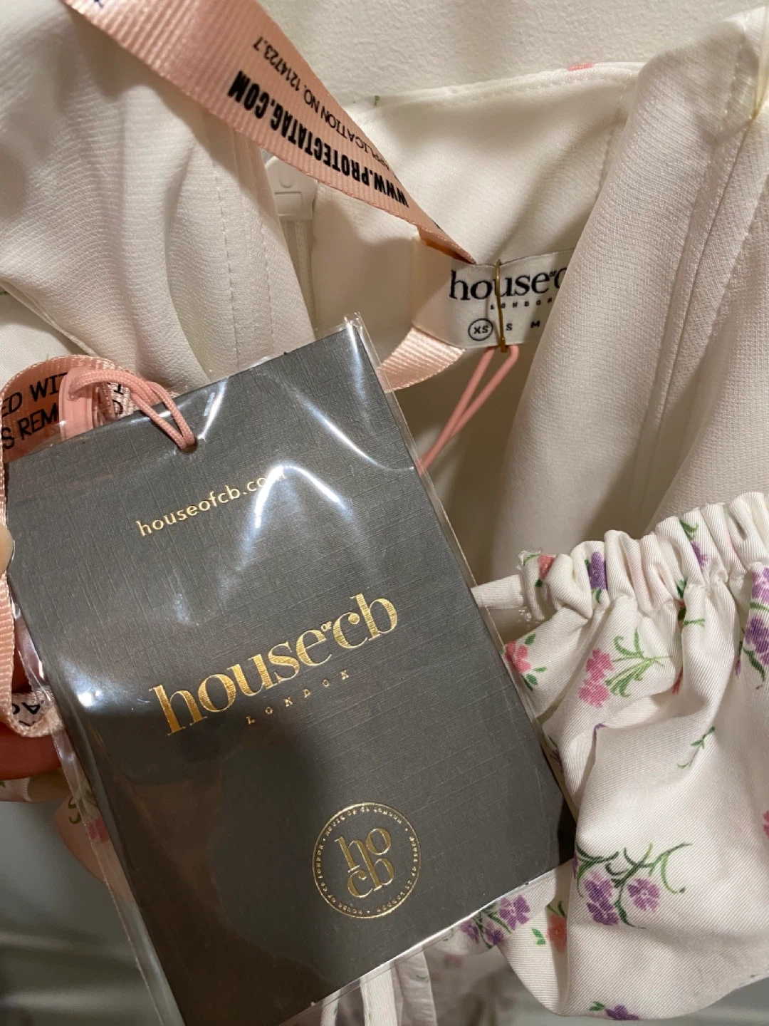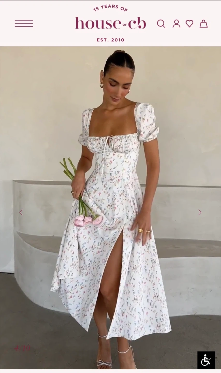 It's the Valeria midi dress from House of CB in white with a pastel floral print. Features puff sleeves, a sweetheart neckline with tie detail, and a high slit. Size XS. New with tags