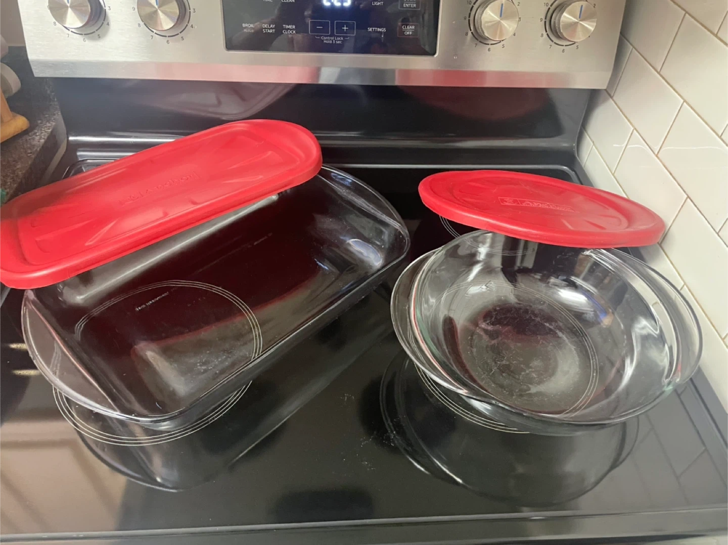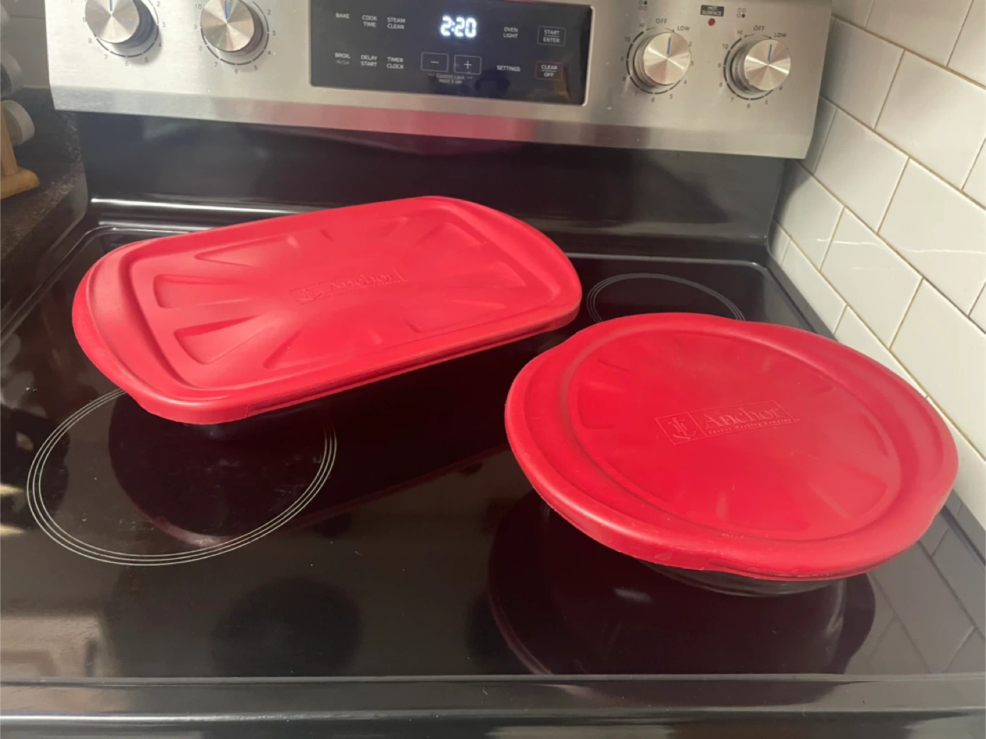 Two Anchor Hocking glass bowls with red plastic lids. Includes one rectangular baking dish and one round mixing bowl. These are handy for storing leftovers or meal prepping!